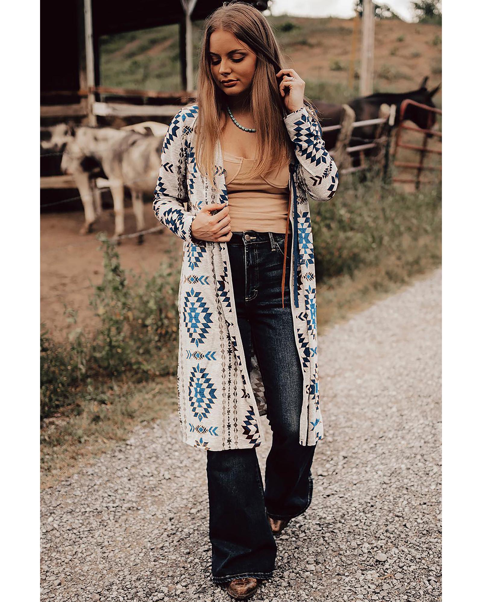 Sky Blue Western Aztec Printed Open Front Long Cardigan – L