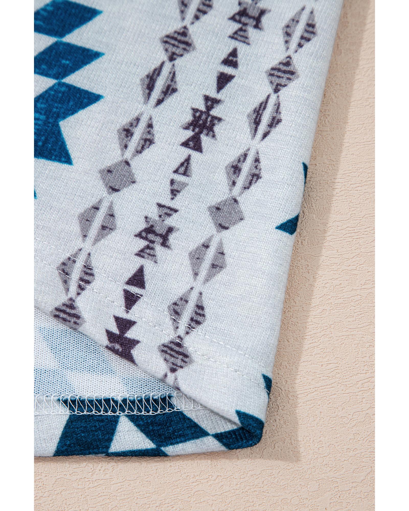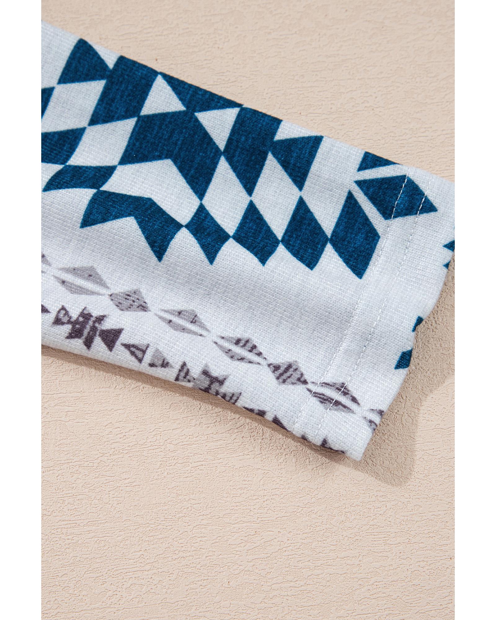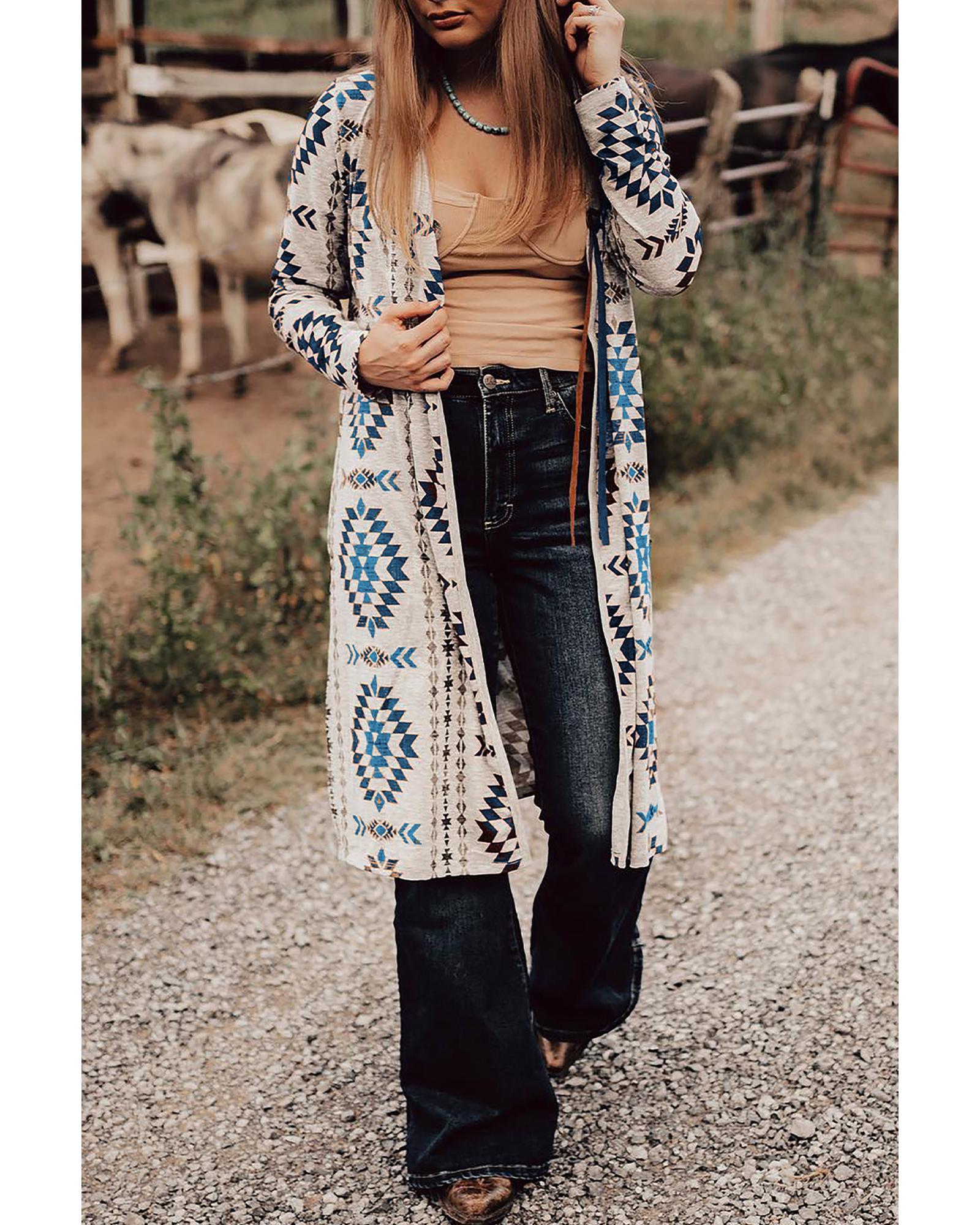 Sky Blue Western Aztec Printed Open Front Long Cardigan – M