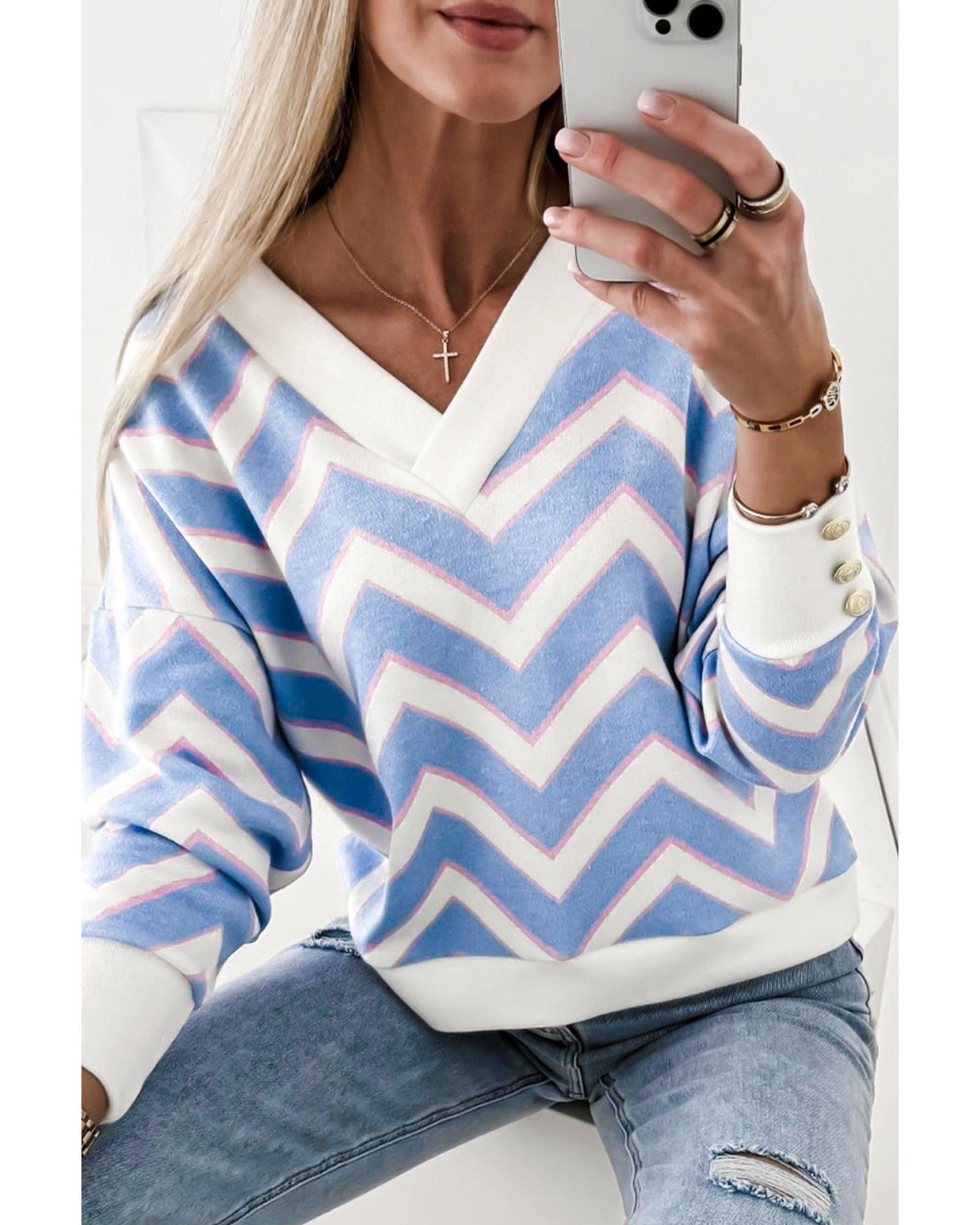 - Sky Blue Zigzag Striped Print V Neck Oversized Top