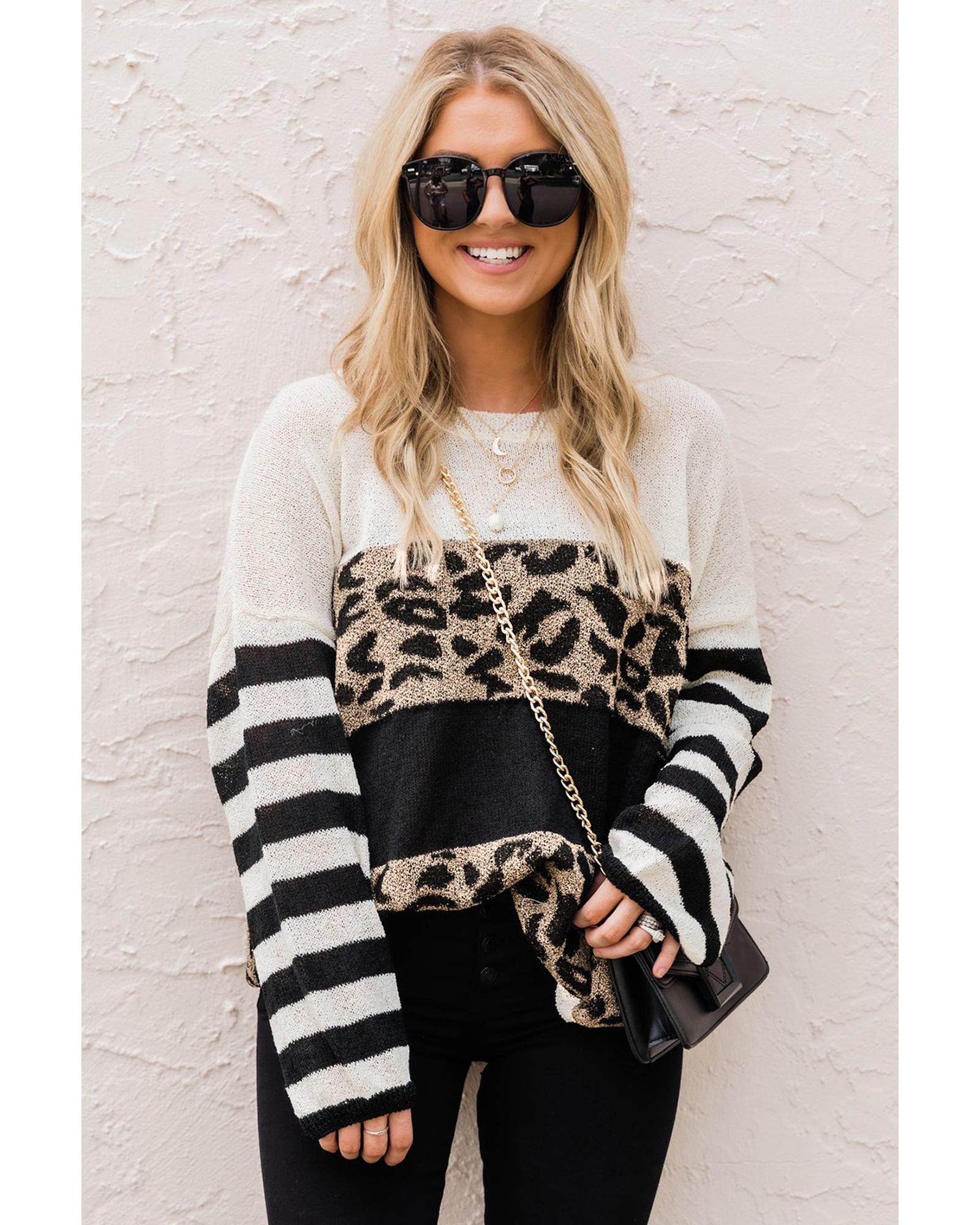 Slouchy drop - shoulder leopard striped colorblock sweater Round neck drop shoulder long sleeves and loose fit style Pairs well with any pants skirts bags and shoes Made with high