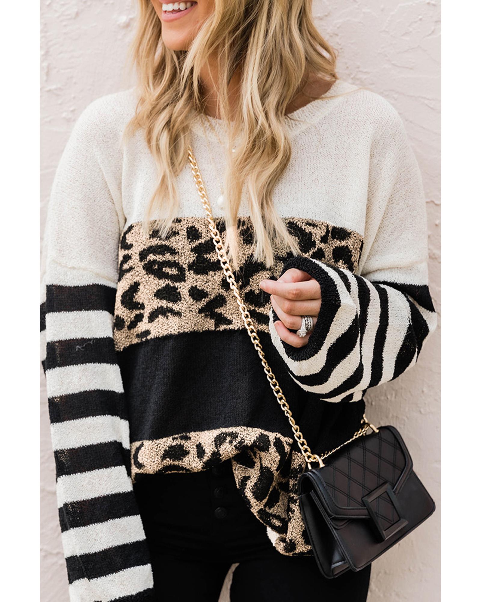 Slouchy drop - shoulder leopard striped colorblock sweater Round neck drop shoulder long sleeves and loose fit style Pairs well with any pants skirts bags and shoes Made with high