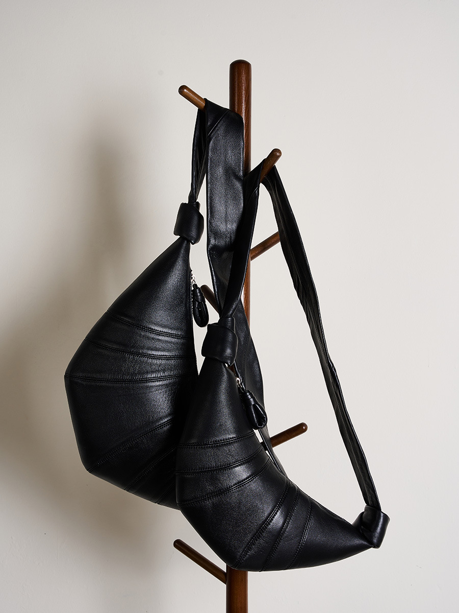 - Unique horn-shaped design inspired by a croissant for a trendy silhouette