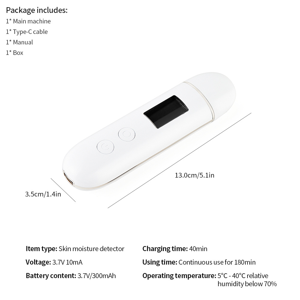 This product contains a lithium battery. Please do not aim the fluorescent lamp directly into eyes. This device is intended for general cosmetic and personal care purposes only and is not a medical device. It should not be used for medical diagnosis or treatment. Consult a healthcare professional or dermatologist for any specific skin concerns or conditions. Ensure the probe is clean before each use for accurate readings. Keep the device dry and clean the probe with a soft cloth after use. Store in a cool, dry place. Keep out of reach of children.