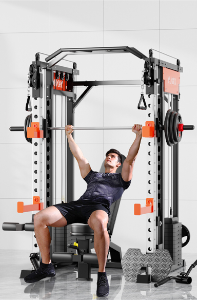 SmithFit M1 is the ultimate machine for home gym and light commercial use.It is the combination of Cable Crossover Station, Chin-Up Station, Smith Machine and Squat Rack with a huge variety of workout stations targeting upper and lower body exercises.This all-in-one machine is designed with an ultra smooth linear bearing Smith system, heavy duty frame, pulleys and cables as well as 140kg pin loaded weights, and enables flexibility to train multiple groups of muscles on the full body.The rack has been engineered using ultra-heavy-duty steel to provide supreme stability as well as exceptional strength durability, particularly when used with loaded barbells. Perfect for a range of different exercises。
