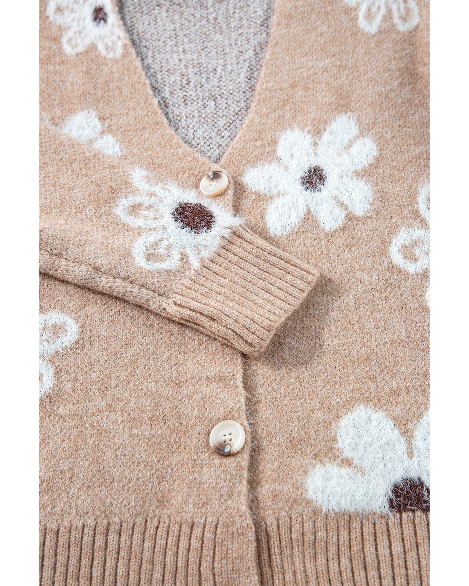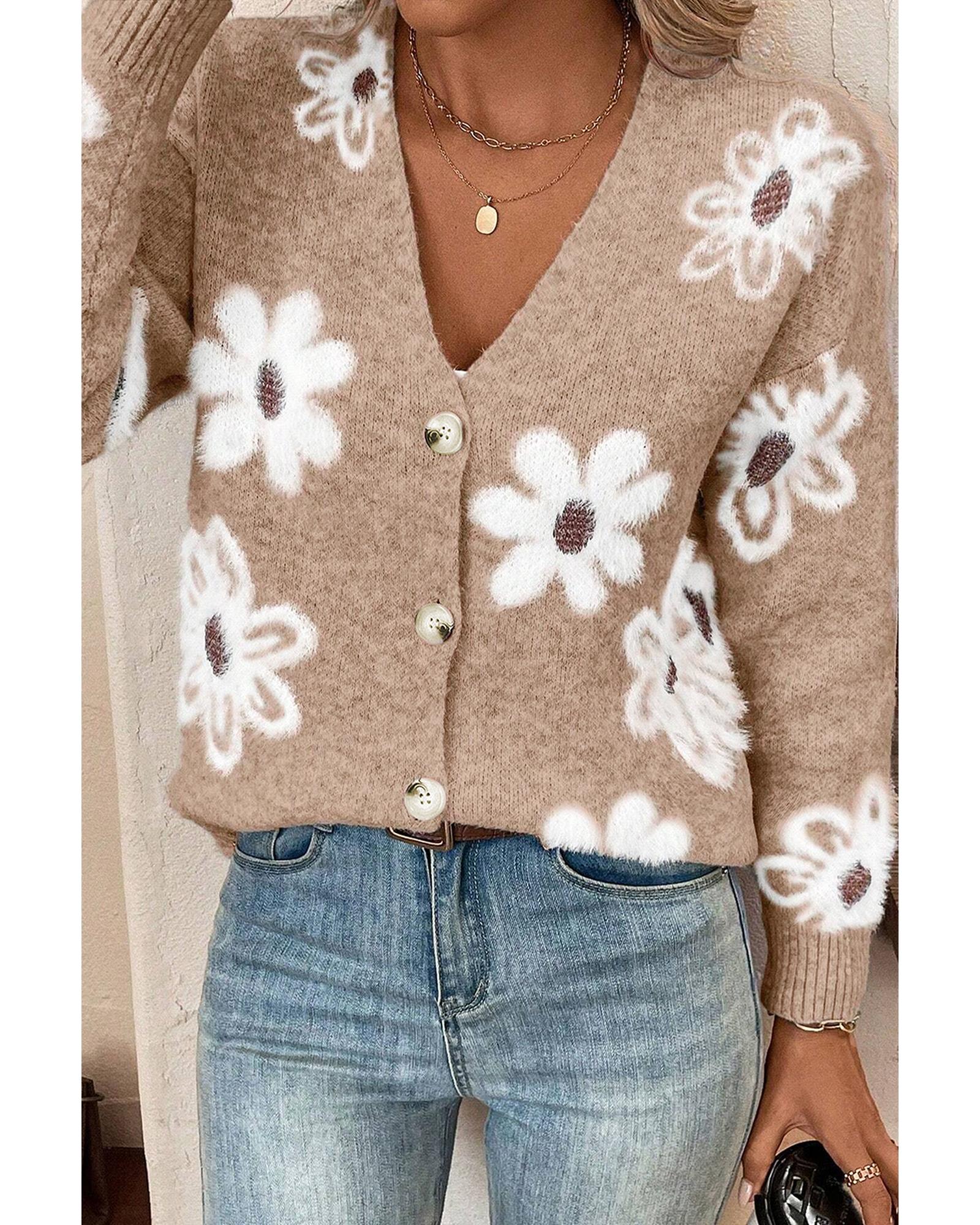 - Smoke Gray Floral Print V Neck Knitted Button up Cardigan