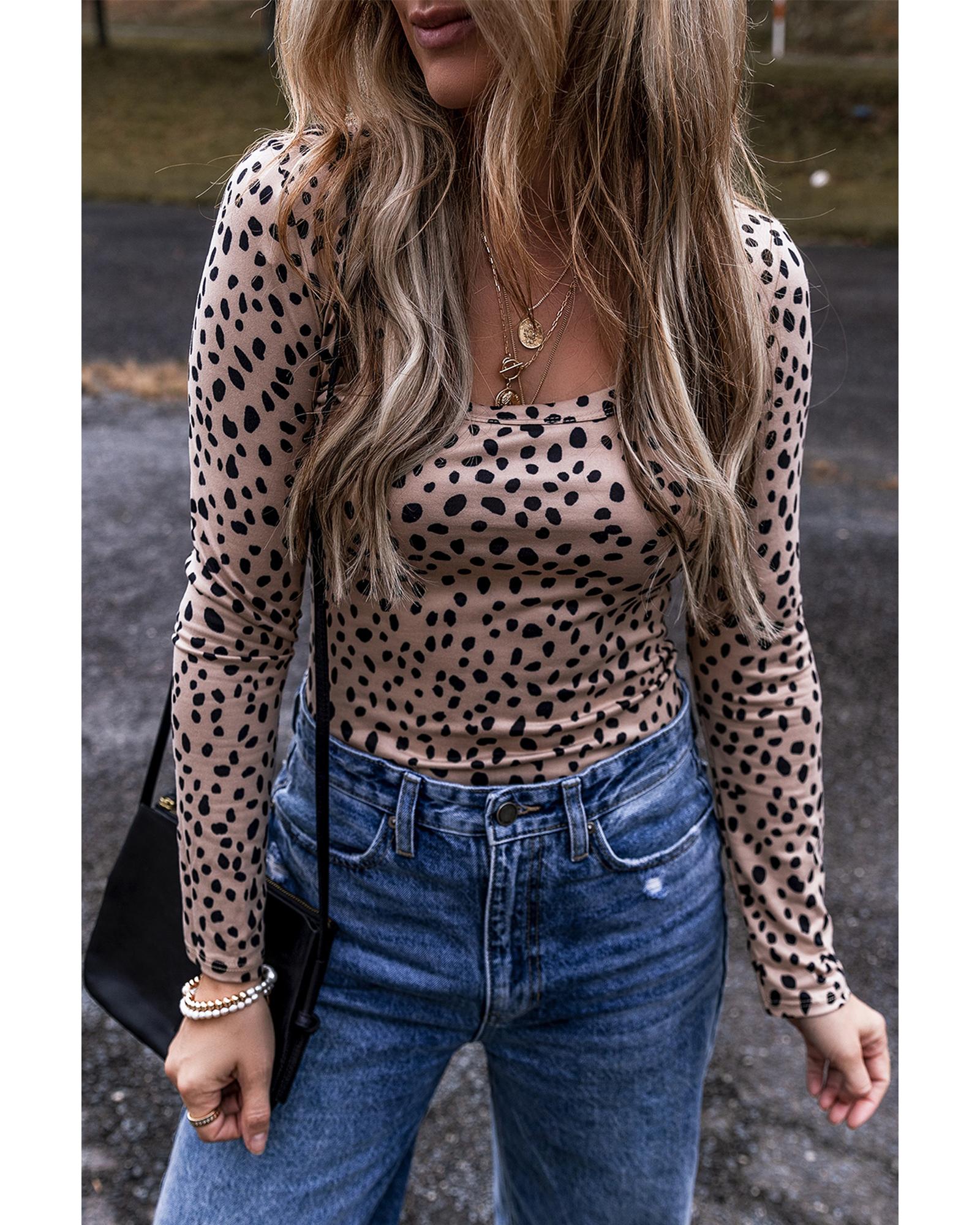 Smoke Gray Leopard Print Long Sleeve Scoop Neck Slim Fit Bodysuit – L