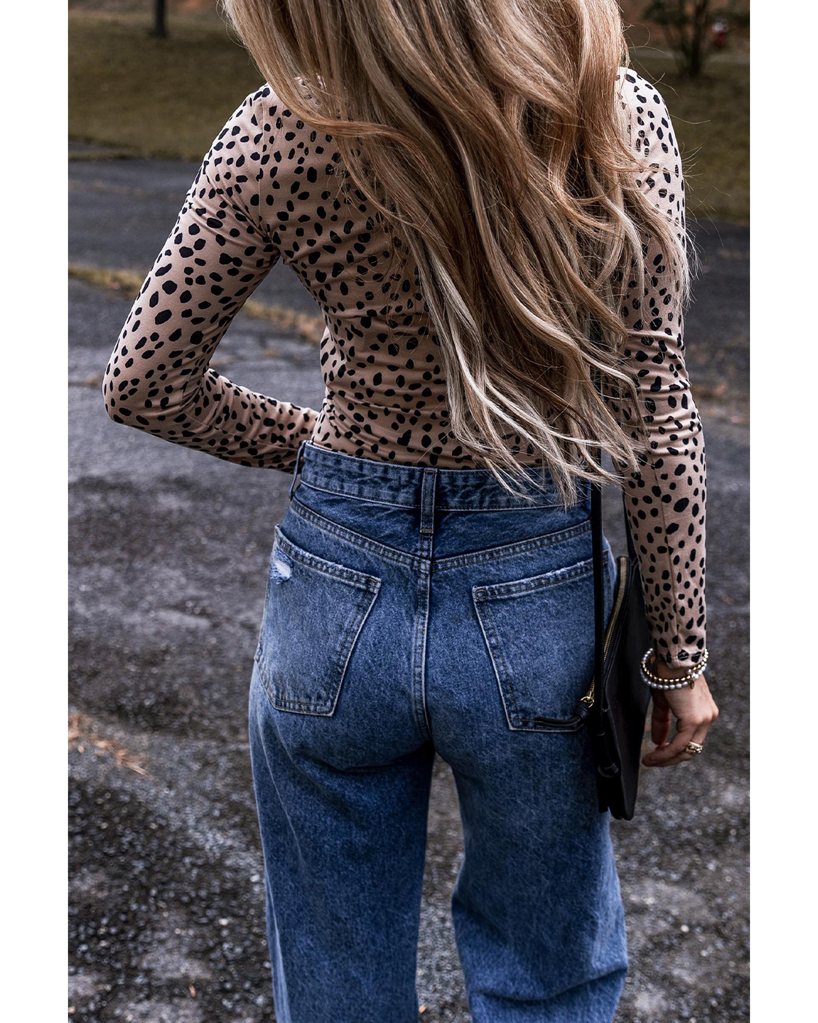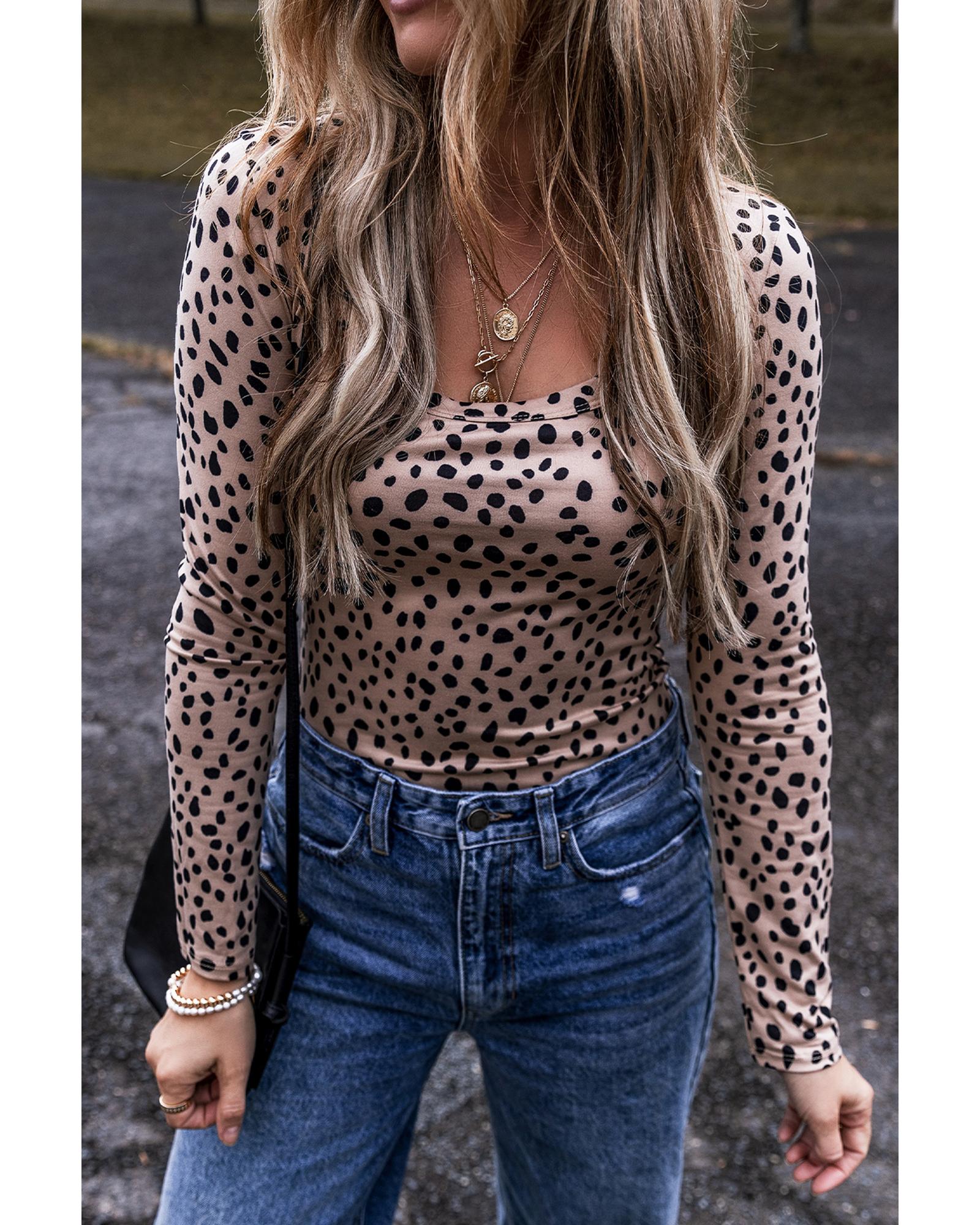 Smoke Gray Leopard Print Long Sleeve Scoop Neck Slim Fit Bodysuit – XL