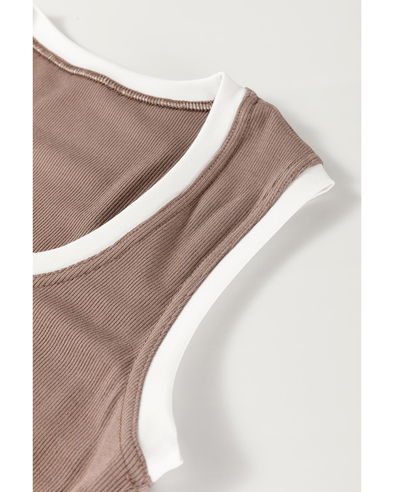 Smoke Gray Ribbed Knit Colorblock Edge U Neck Slim Fit Tank Top – M