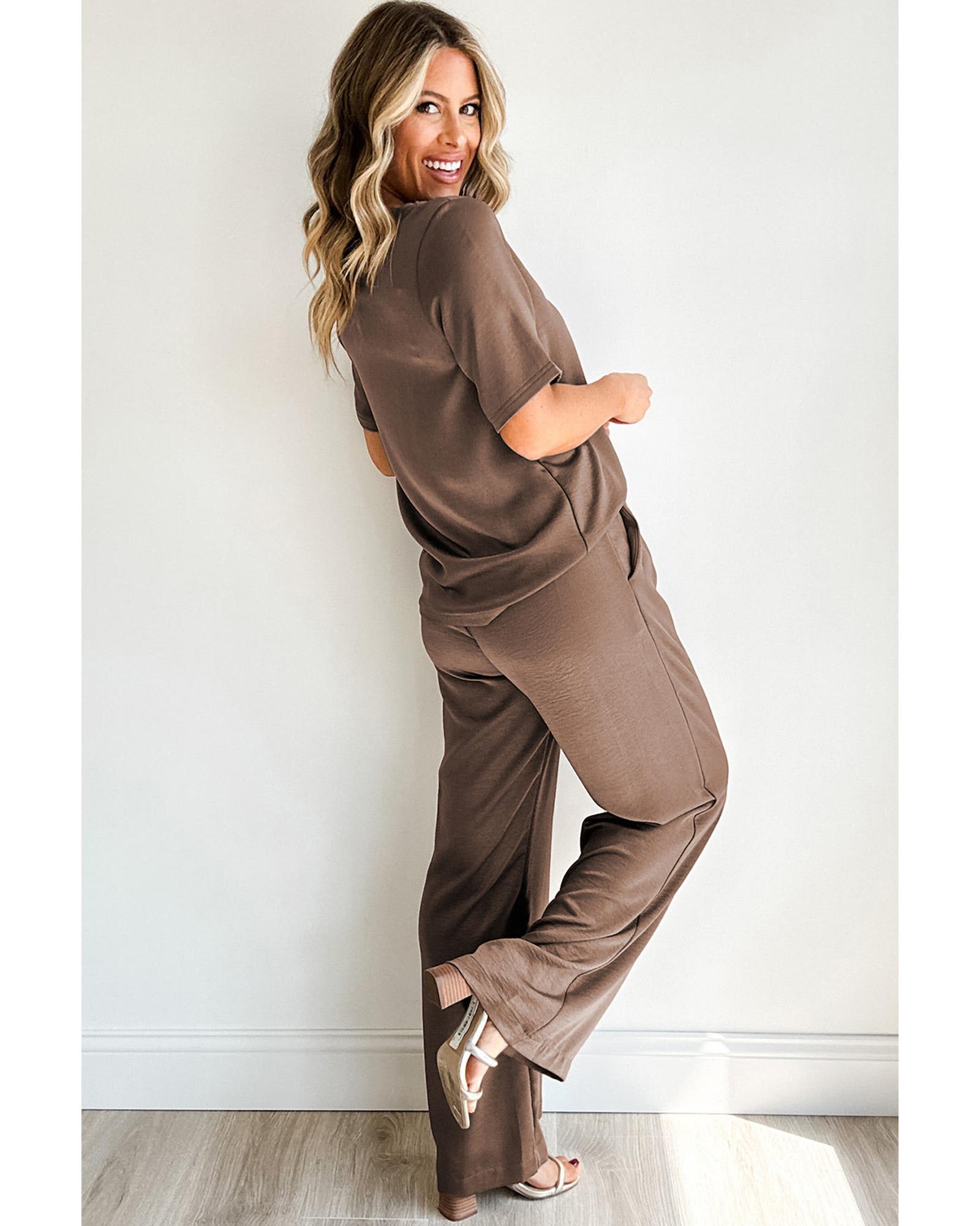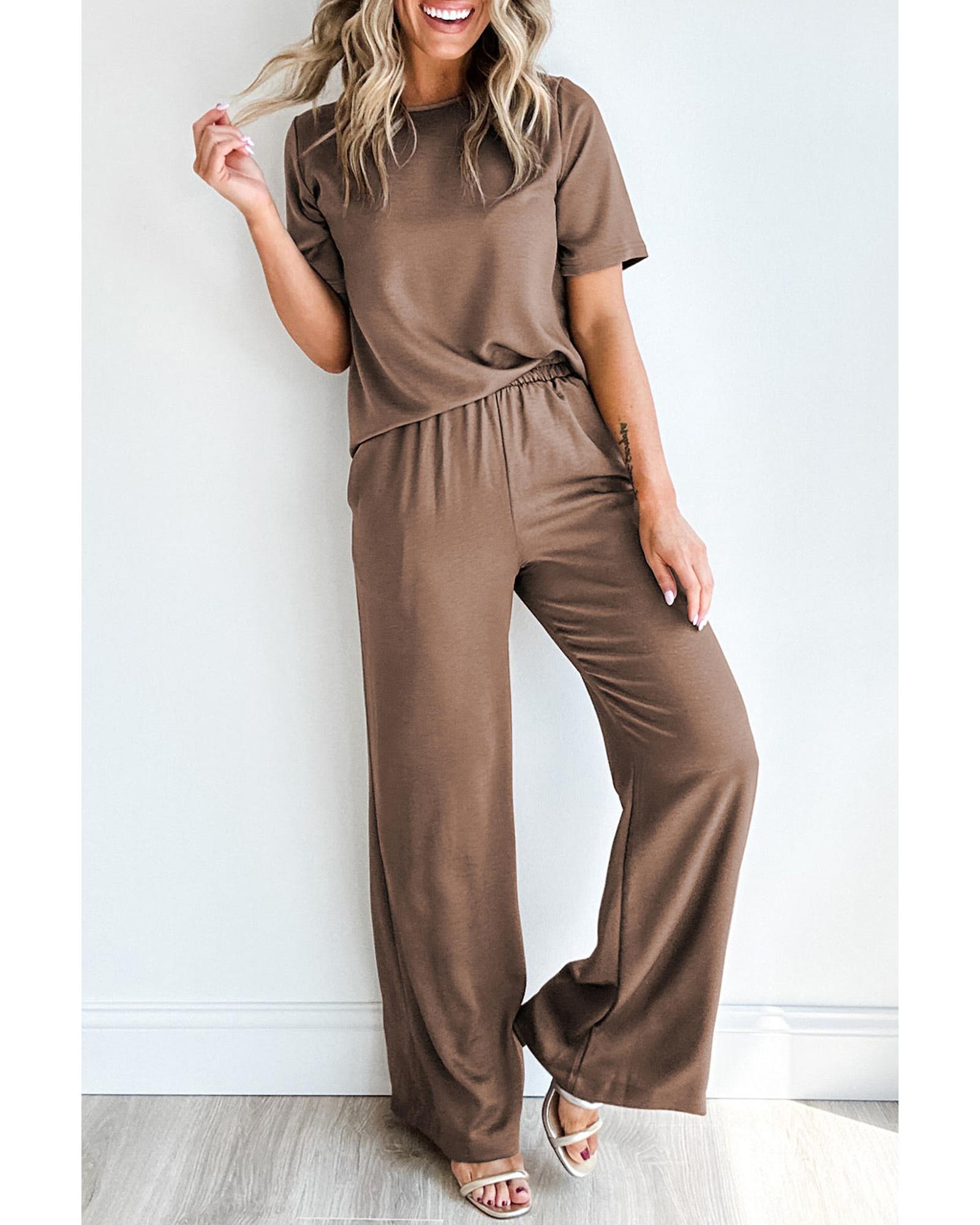 Smoke Gray Solid Color T Shirt 2pcs Wide Leg Pants Set – L