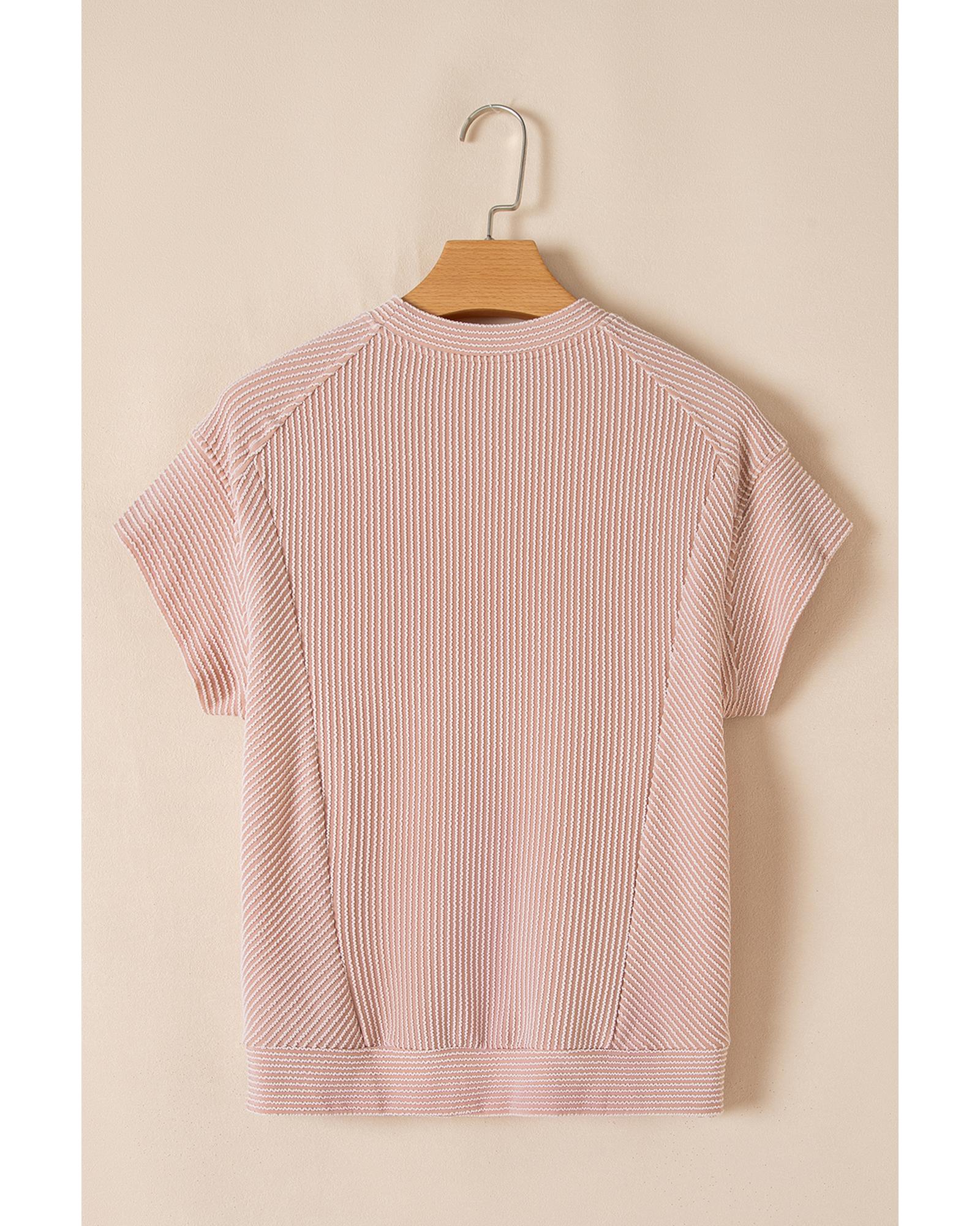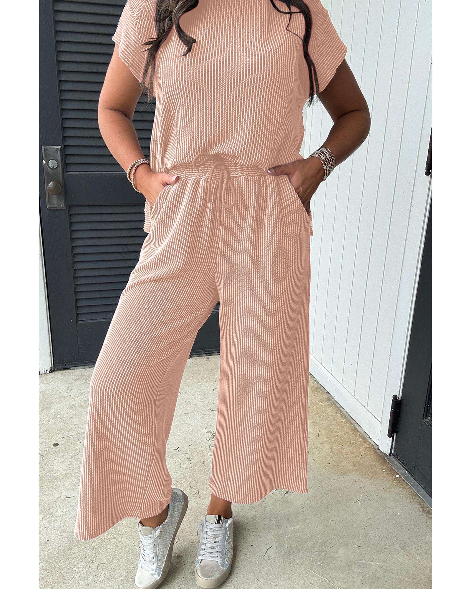 Smoke Gray Solid Corded Knit Short Sleeve T Shirt and Wide Leg Pants Set – L