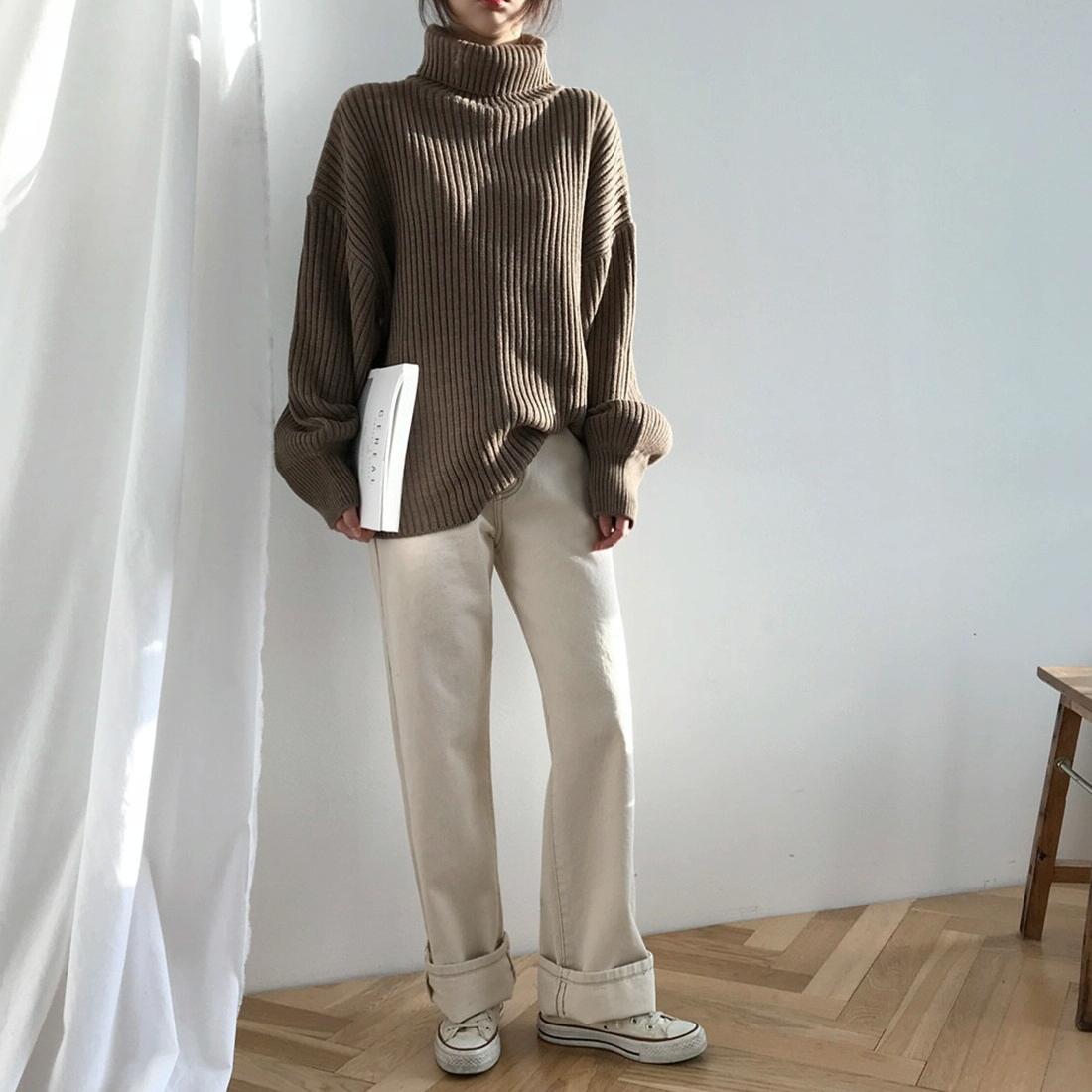 • 1 x Solid Colour Turtleneck Outer Wear Pullover Casual Sweater Beige – Free Size