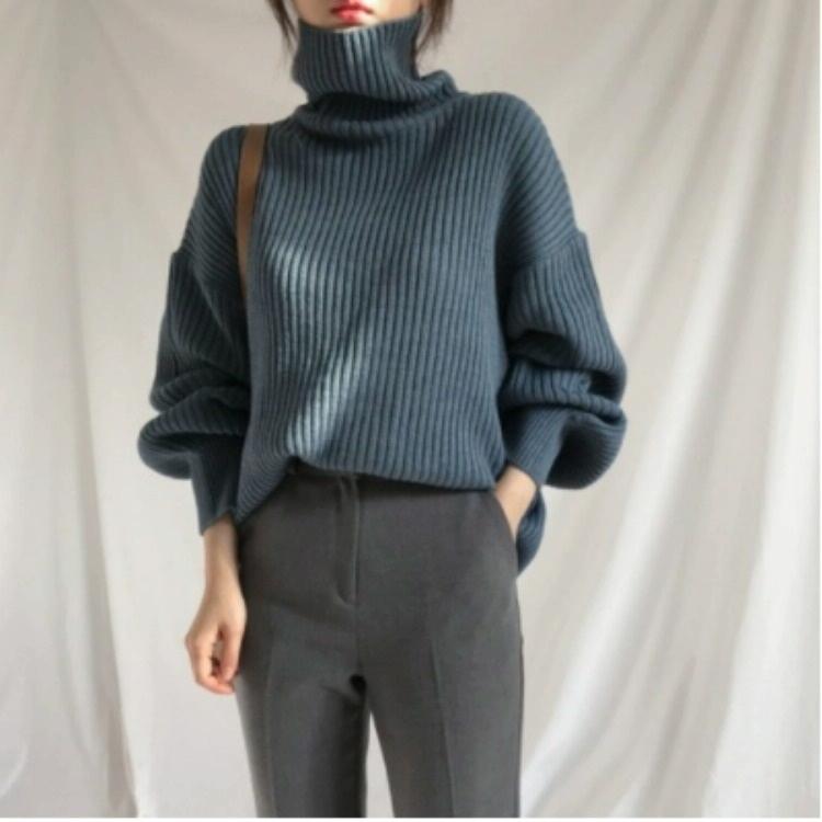 Solid Colour Turtleneck Outer Wear Pullover Casual Sweater Beige – Free Size – Blue Grey Free Size