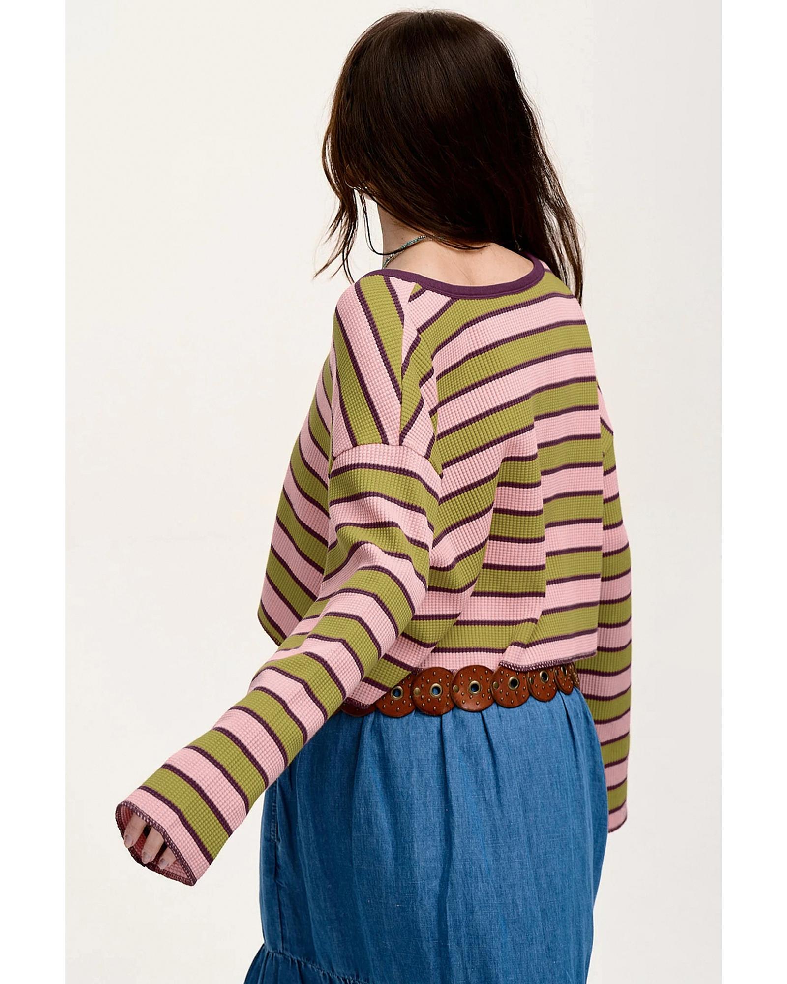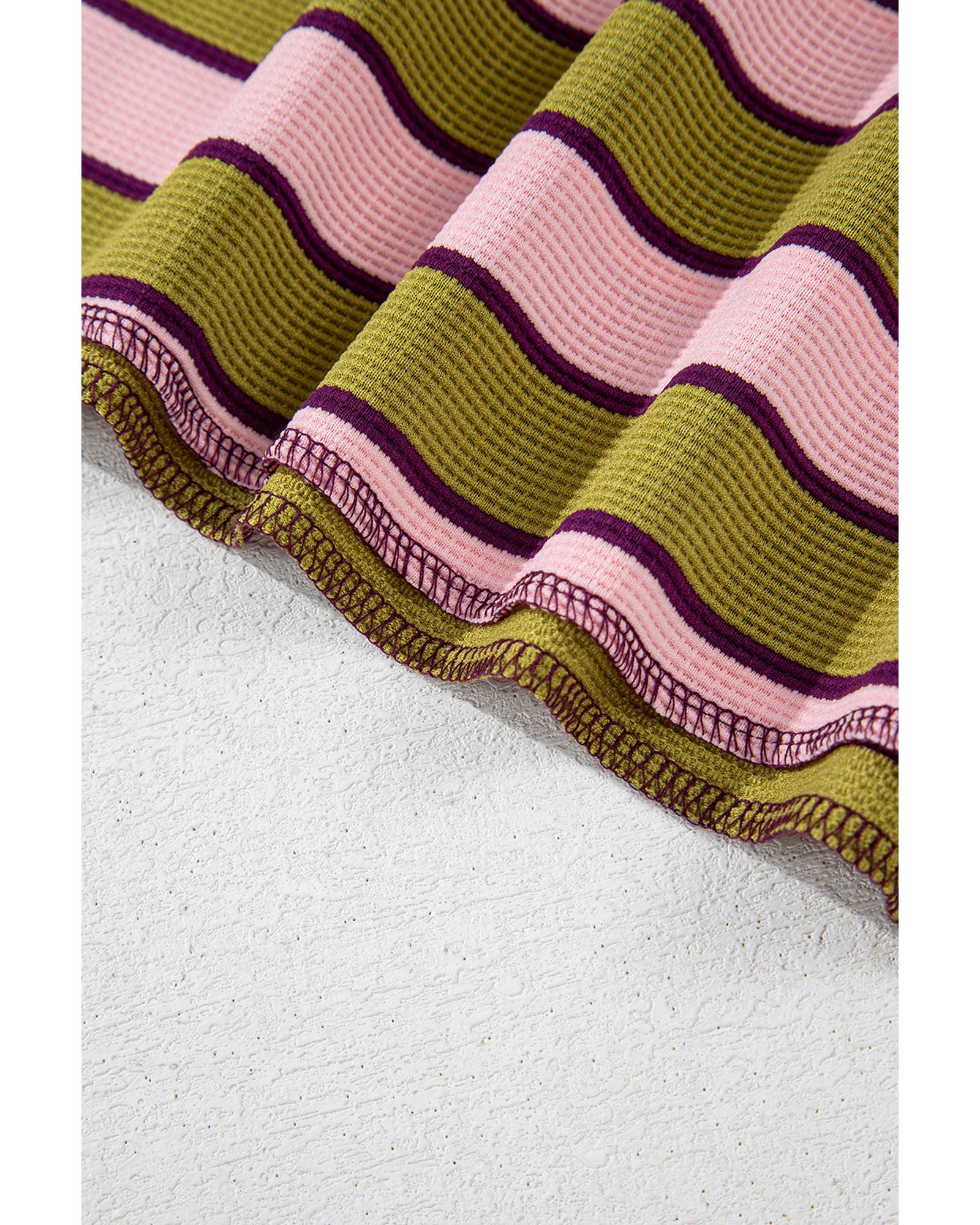 Spinach Green Clashing Stripes Waffle Texture Notched Neck Long Sleeve Top – L