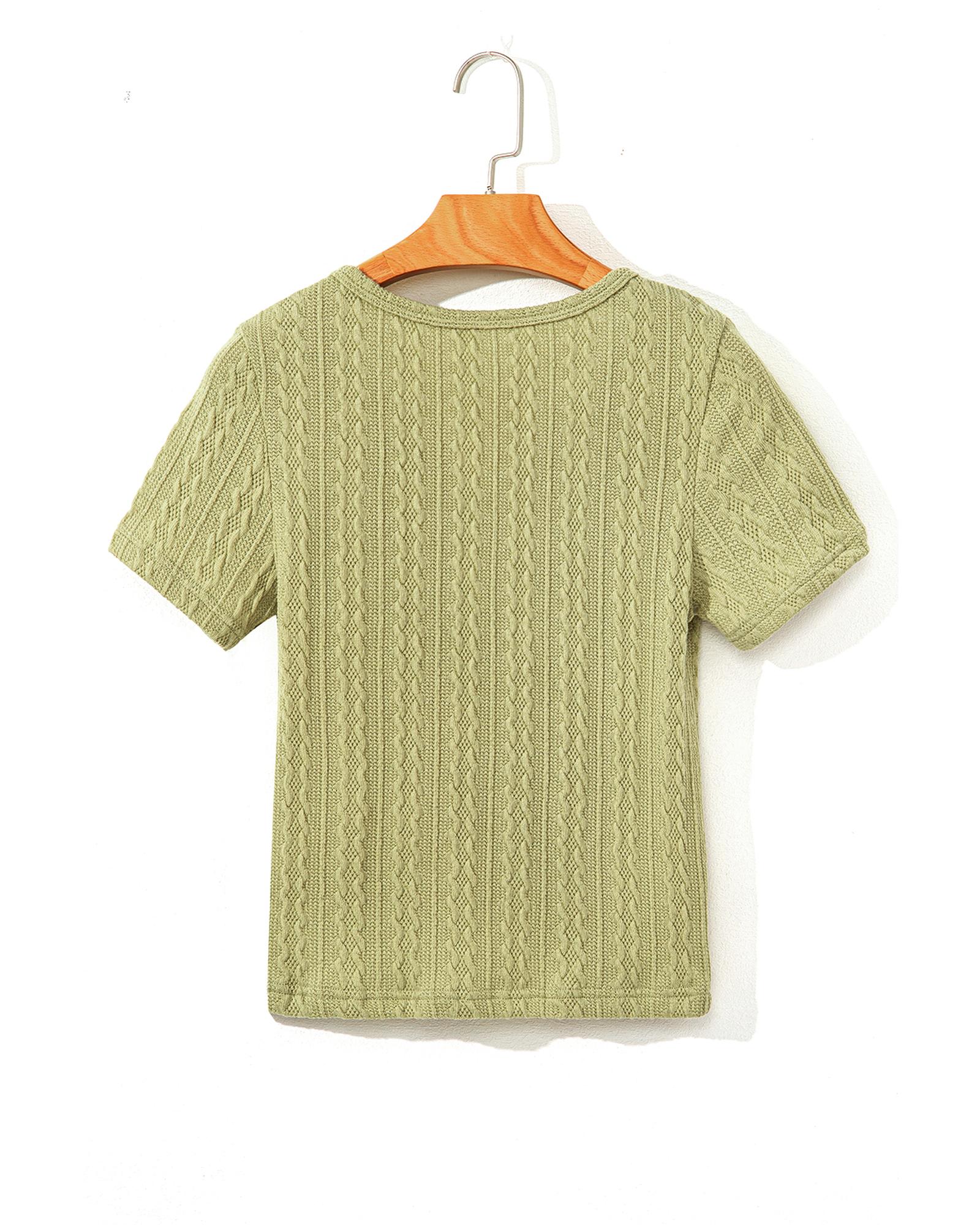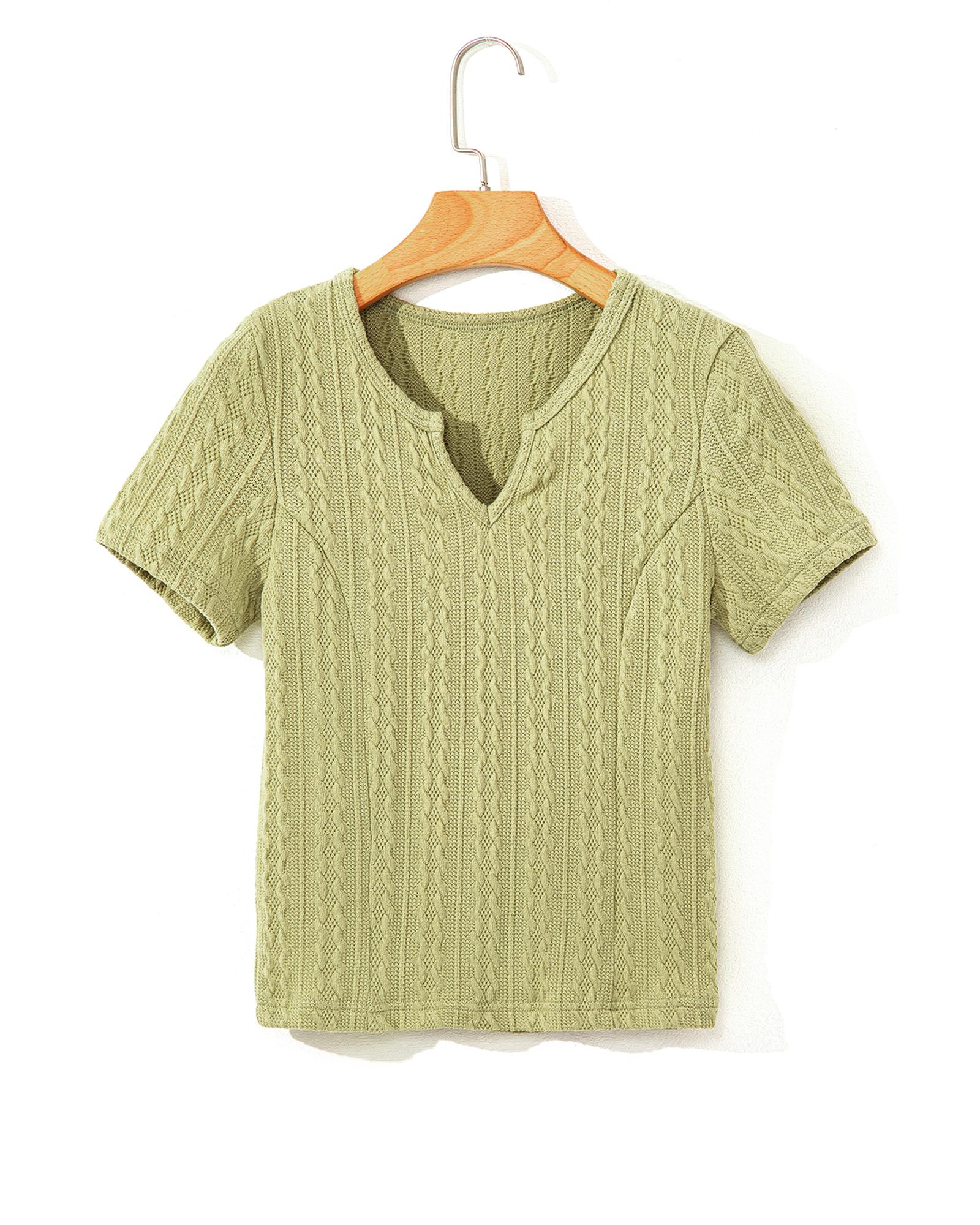 Spinach Green Textured Knit Slim Fit Notch V Neck T Shirt – S