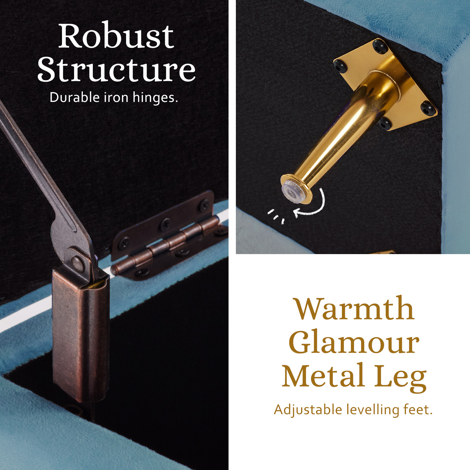 With sleek metal legs for stability, lift the lid to find a roomy interior – ideal for storing blankets and pillows discreetly. This Ottoman Storage is more than practical; it’s versatile, serving as a comfy footrest or extra seating for guests.