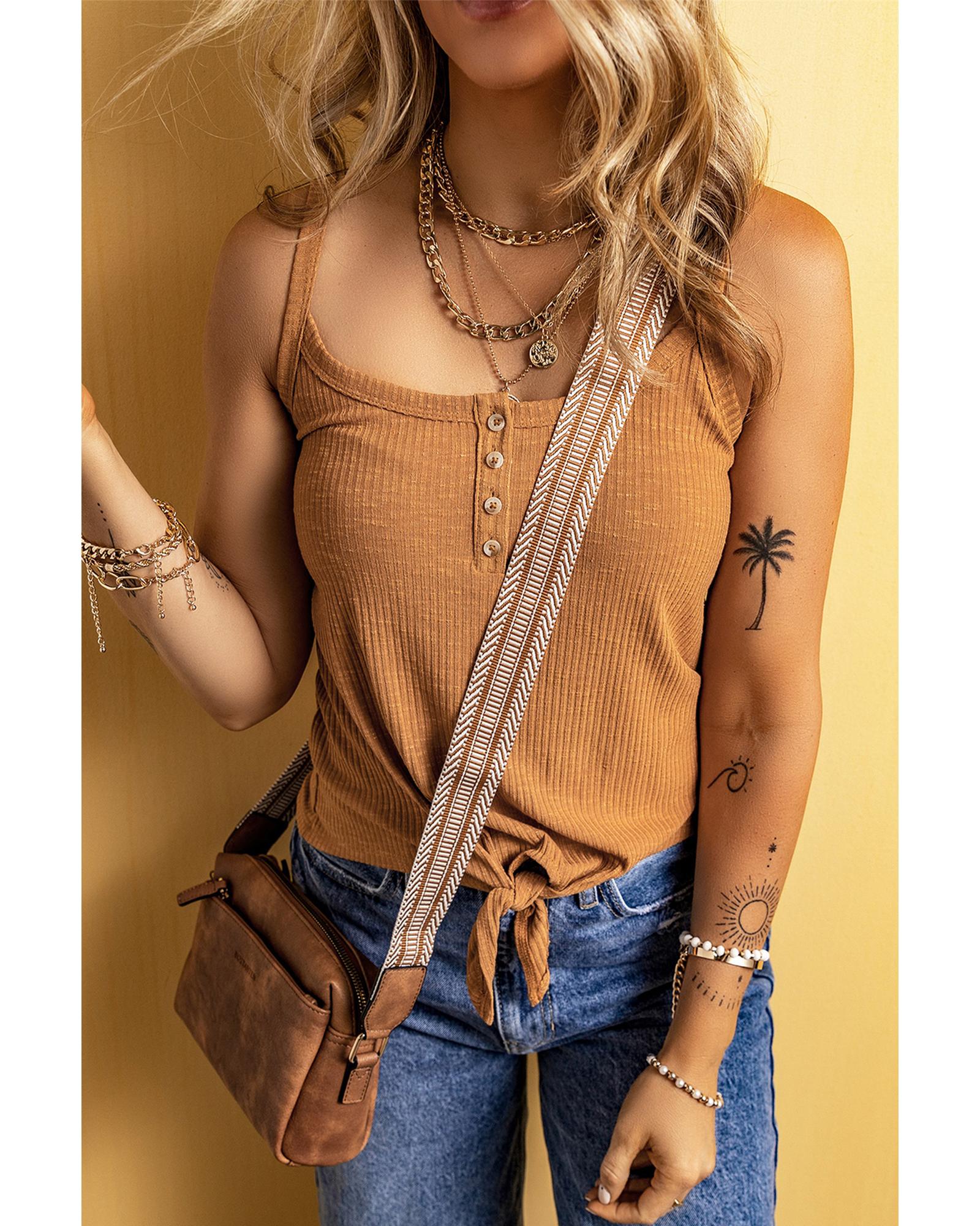 Straw Yellow Ribbed Front Knot Buttoned Thin Strap Tank Top – L