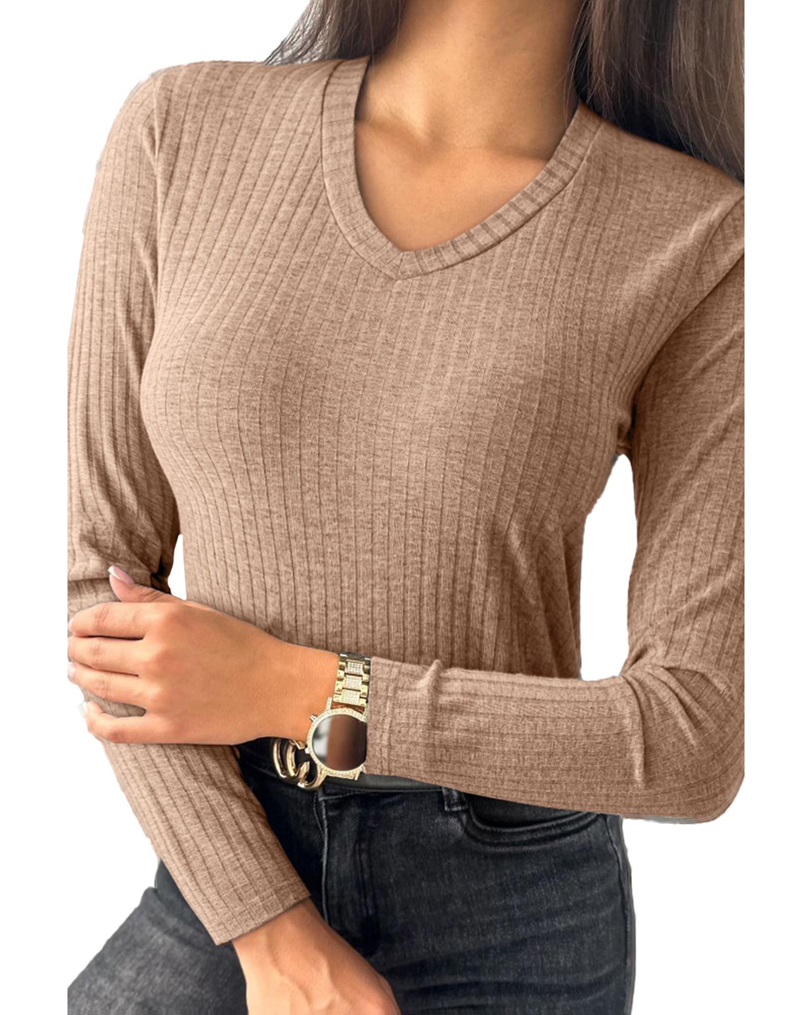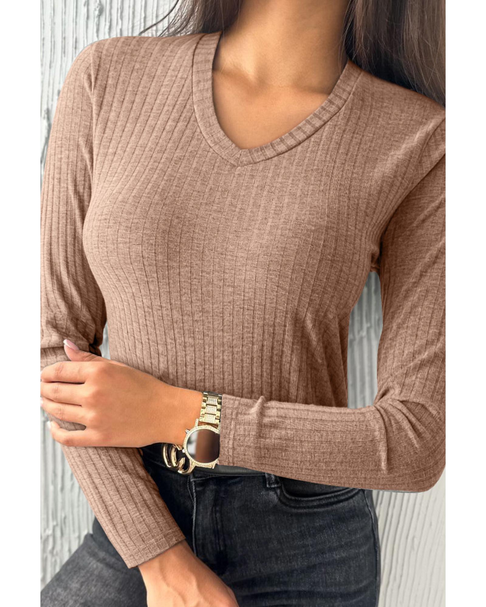 Straw Yellow Ribbed Knit V Neck Long Sleeve Slim Fit Top – XL