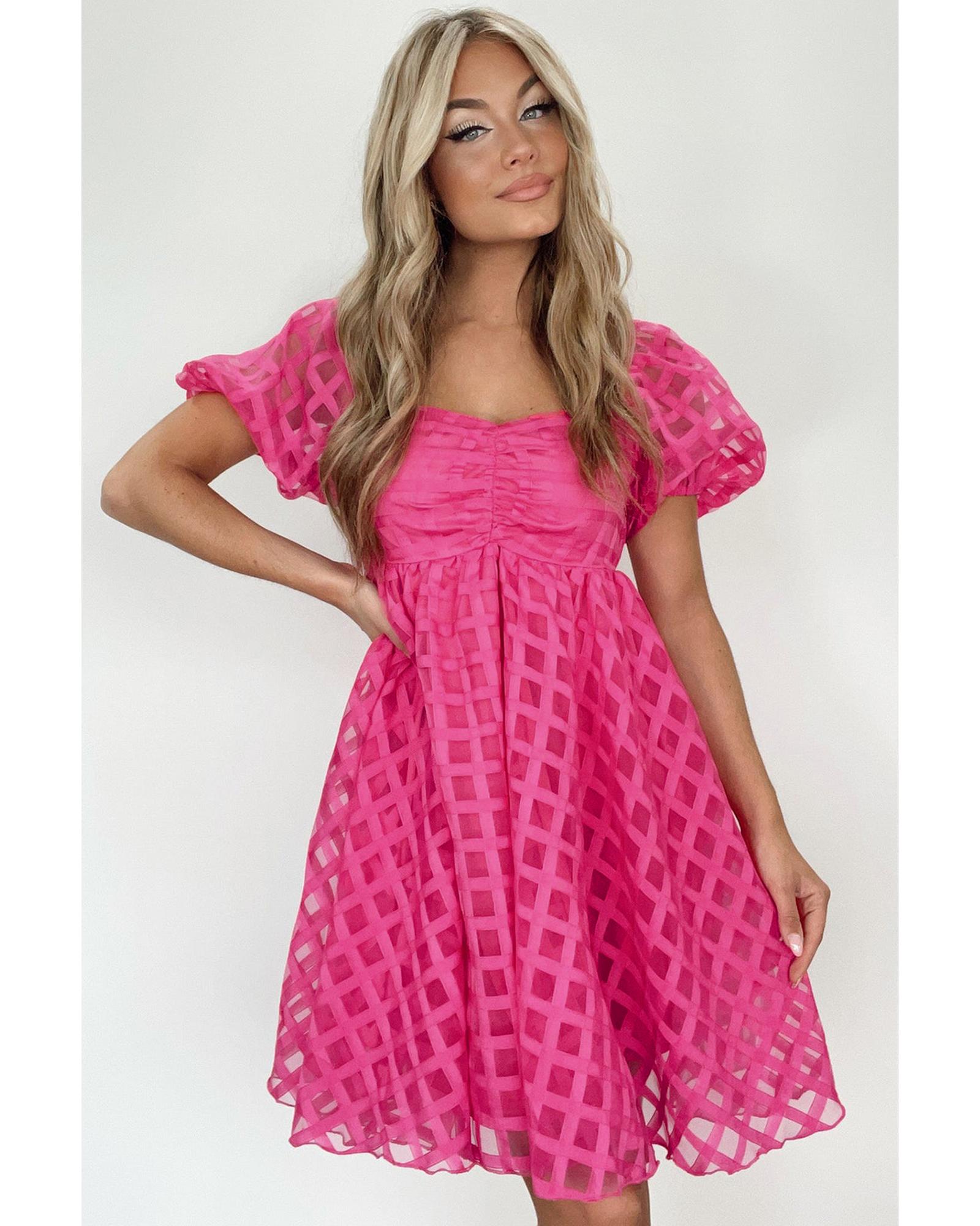 - Chic and classic Strawberry Pink Checkered Puff Sleeve Babydoll Dress