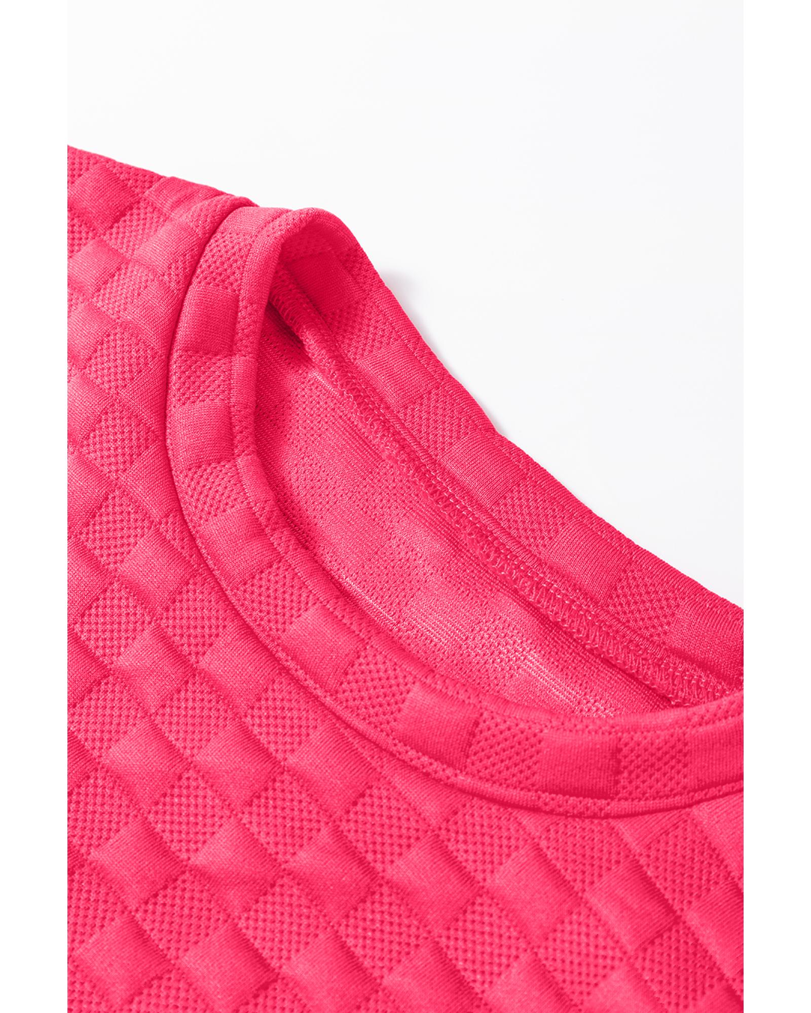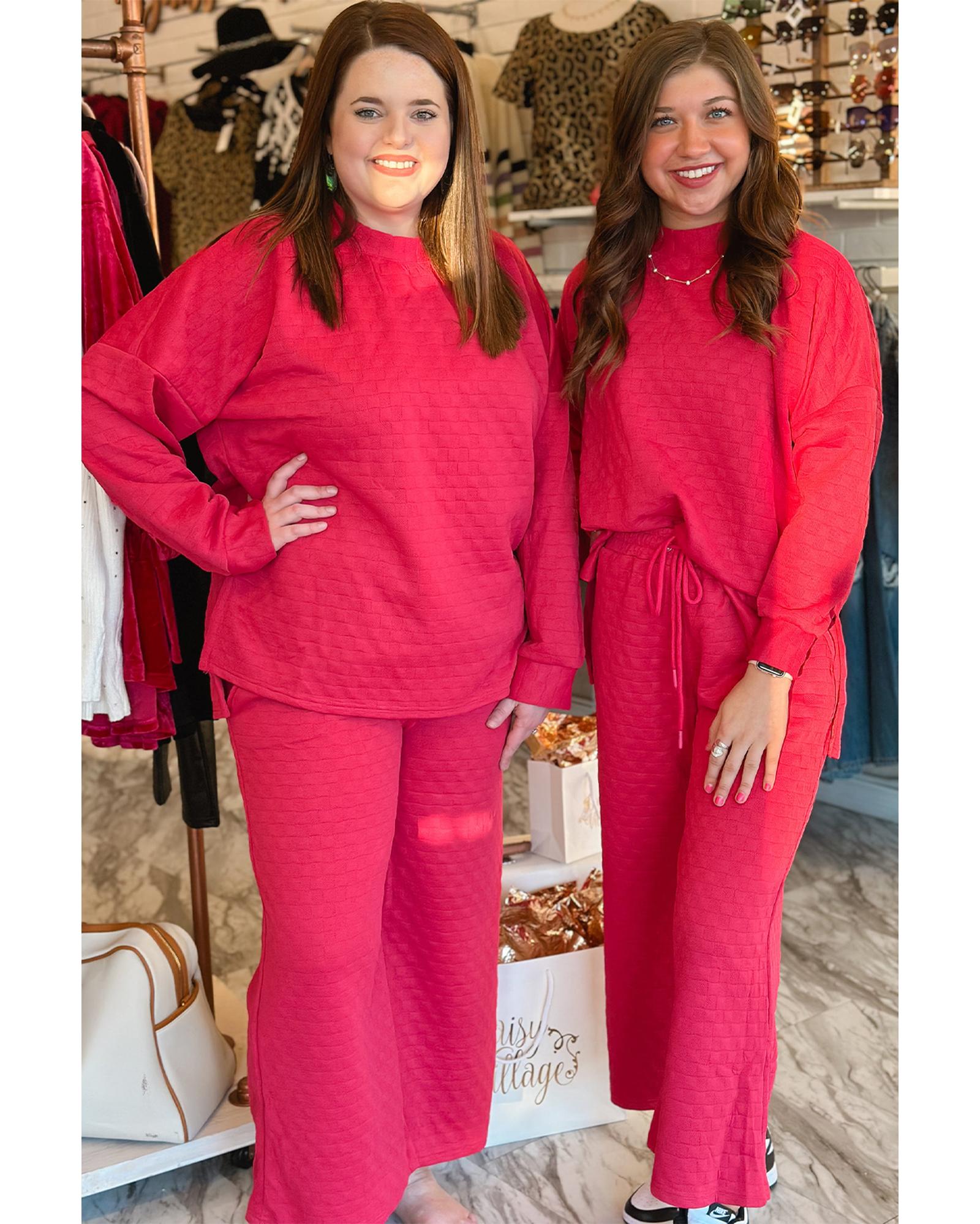 - Strawberry Pink Checkered Textured Split Pullover Top and Pants Set