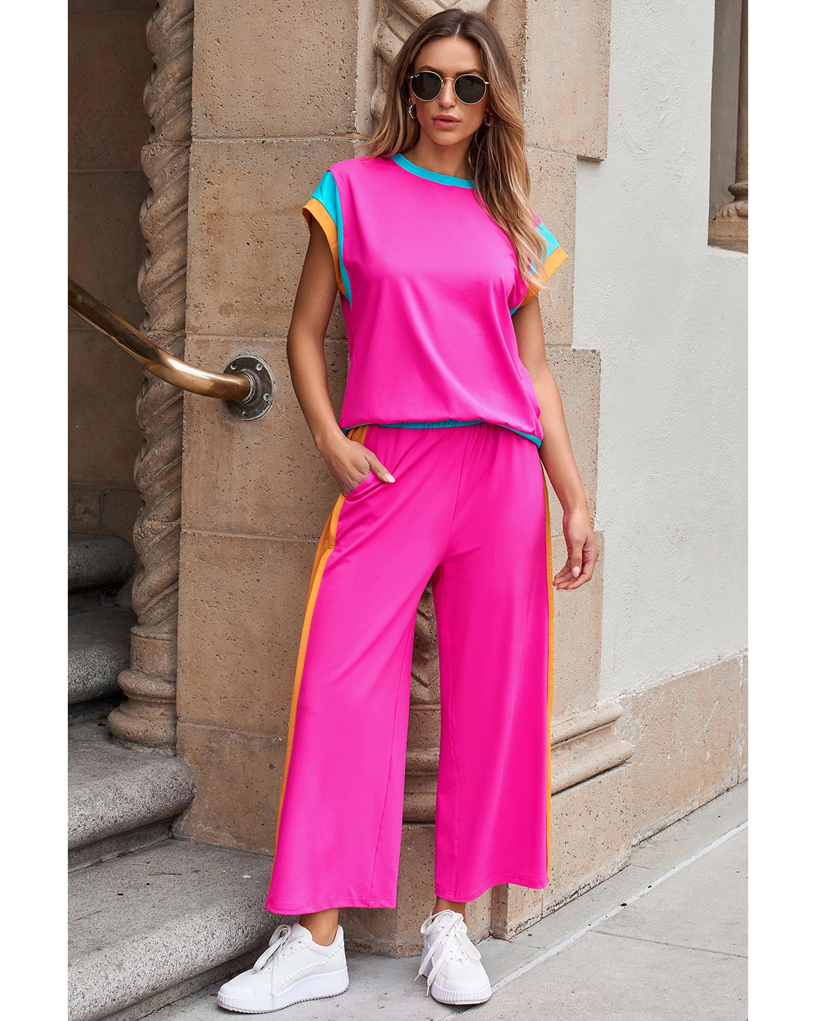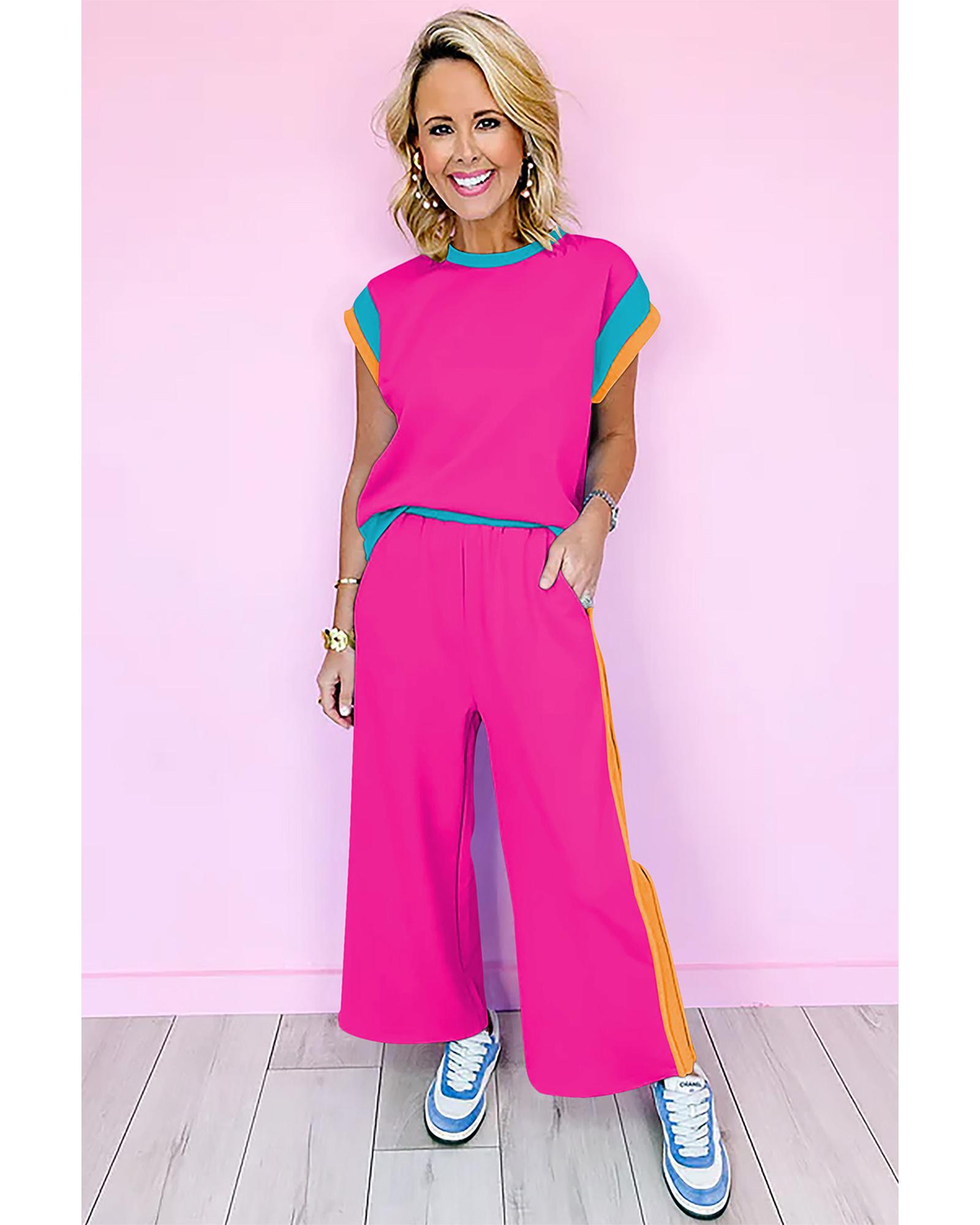 Strawberry Pink Color Block Detail Casual Two-piece Set – 2XL