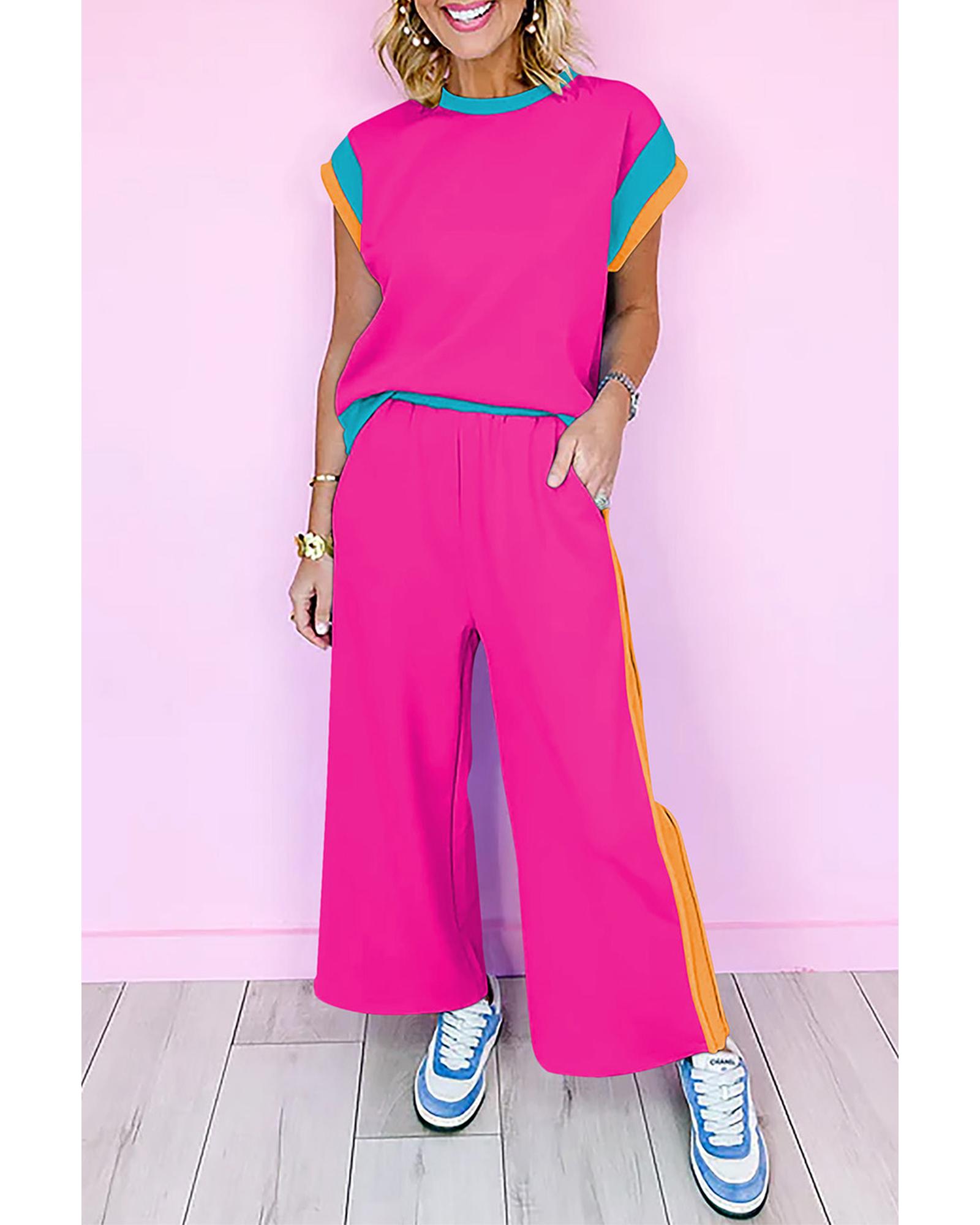Strawberry Pink Color Block Detail Casual Two-piece Set – S