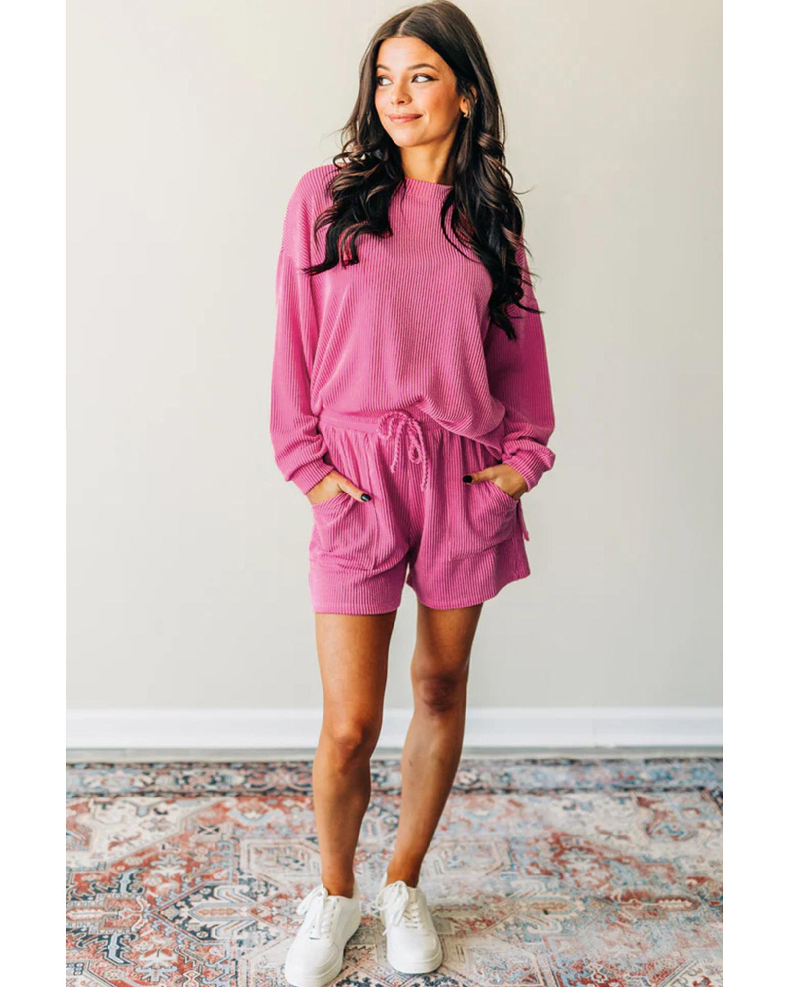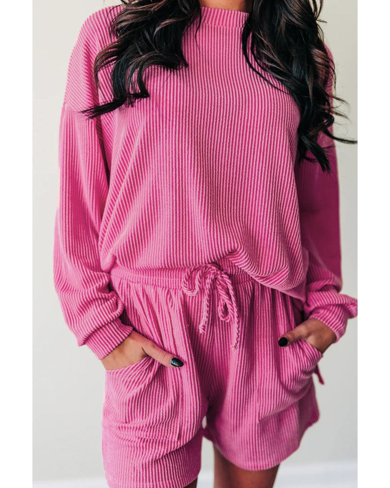 - Strawberry Pink Corded Textured Long Sleeve Top and Shorts Set