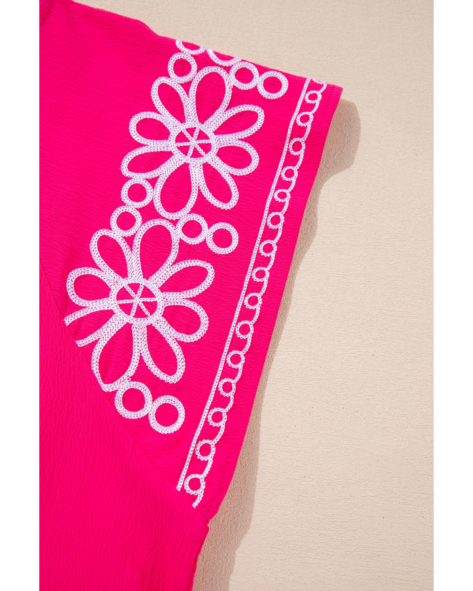 - Strawberry Pink Floral Embroidered Flutter Sleeve Pleated O Neck Plus Size Blouse