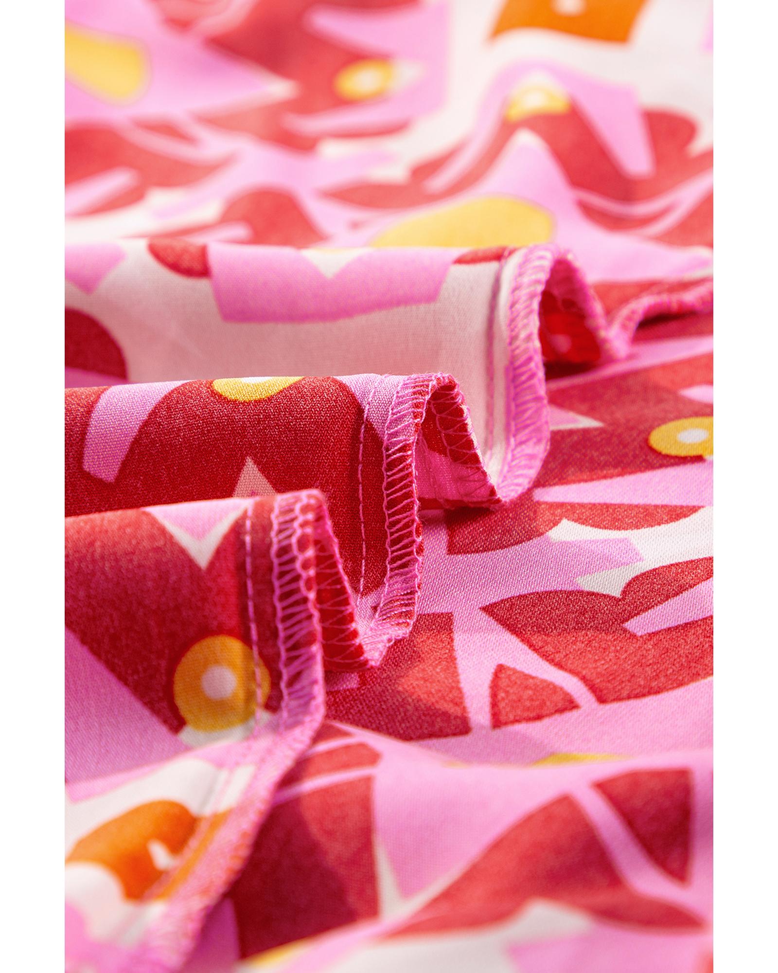 Strawberry Pink Geometric Print Shirred Cuff 3/4 Sleeve Loose Blouse – S