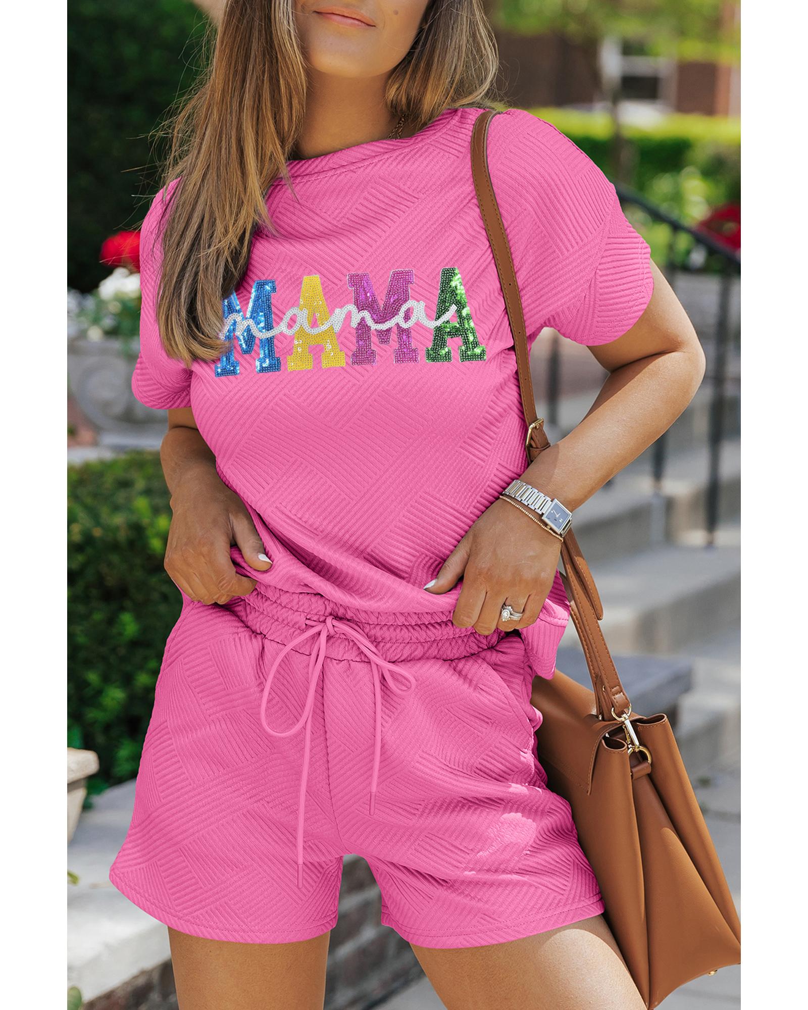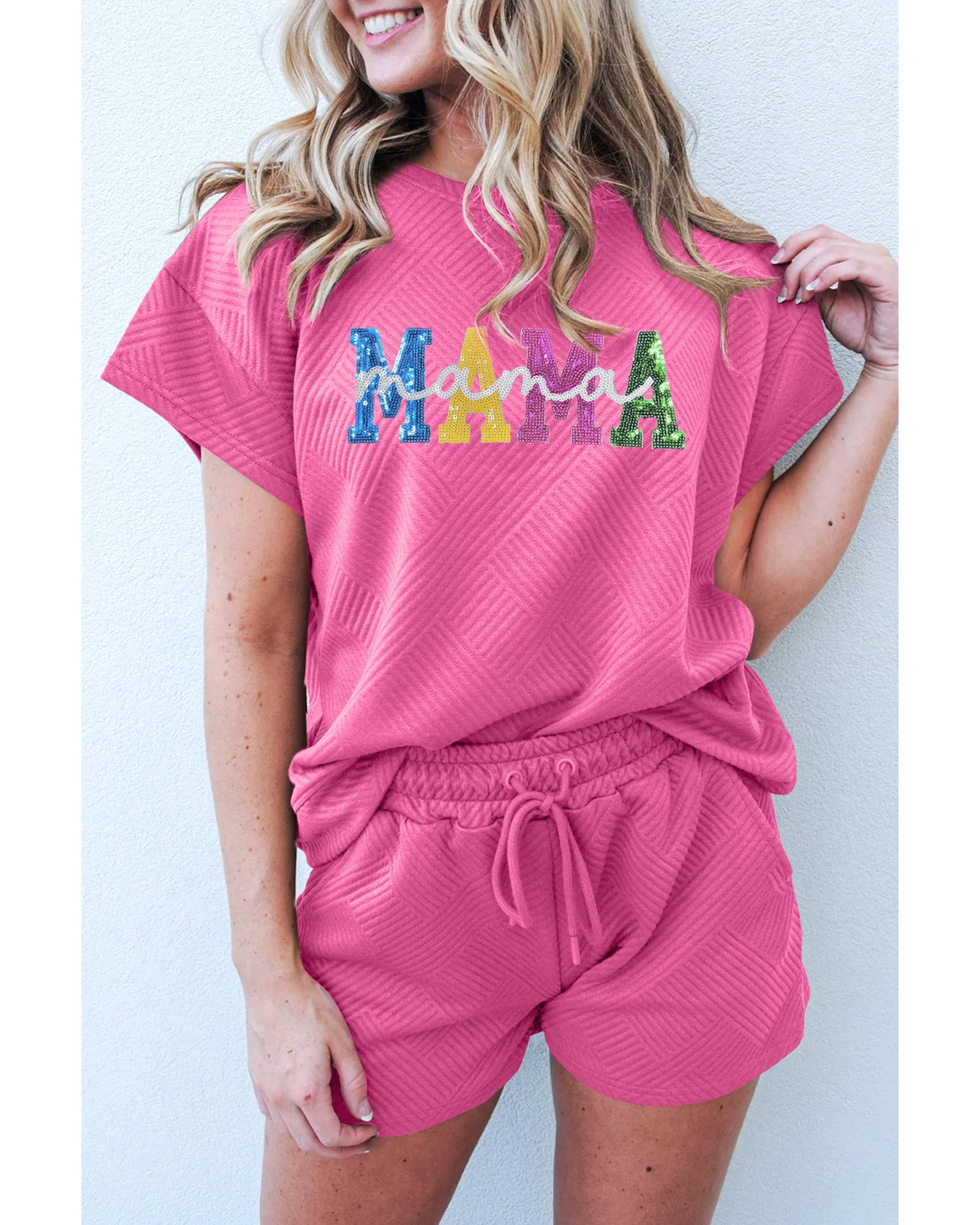 Strawberry Pink Sequined MAMA Letter Graphic Textured Short 2pcs Set – L