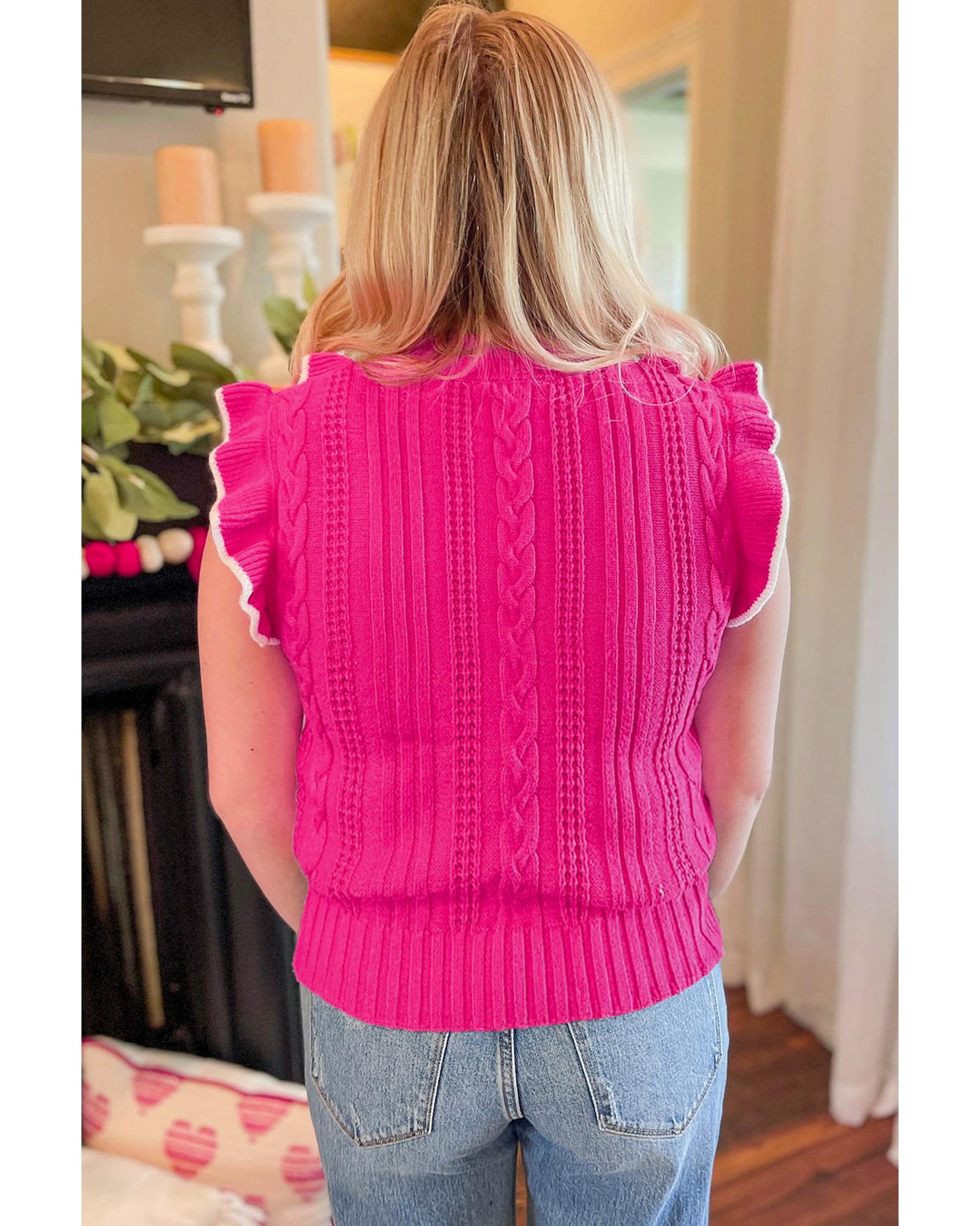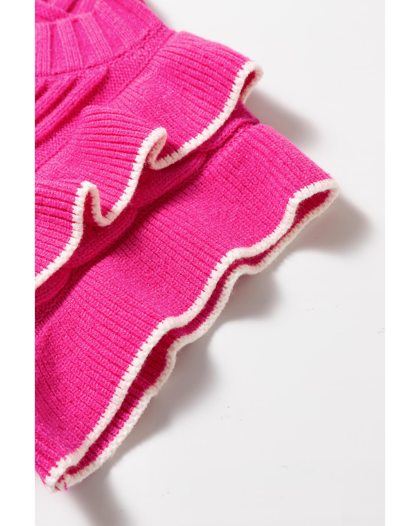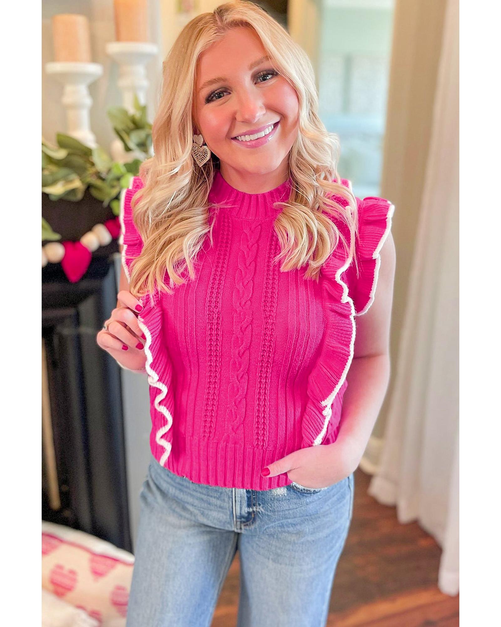 - Strawberry Pink Textured Knit Ruffled Mock Neck Sweater Tank