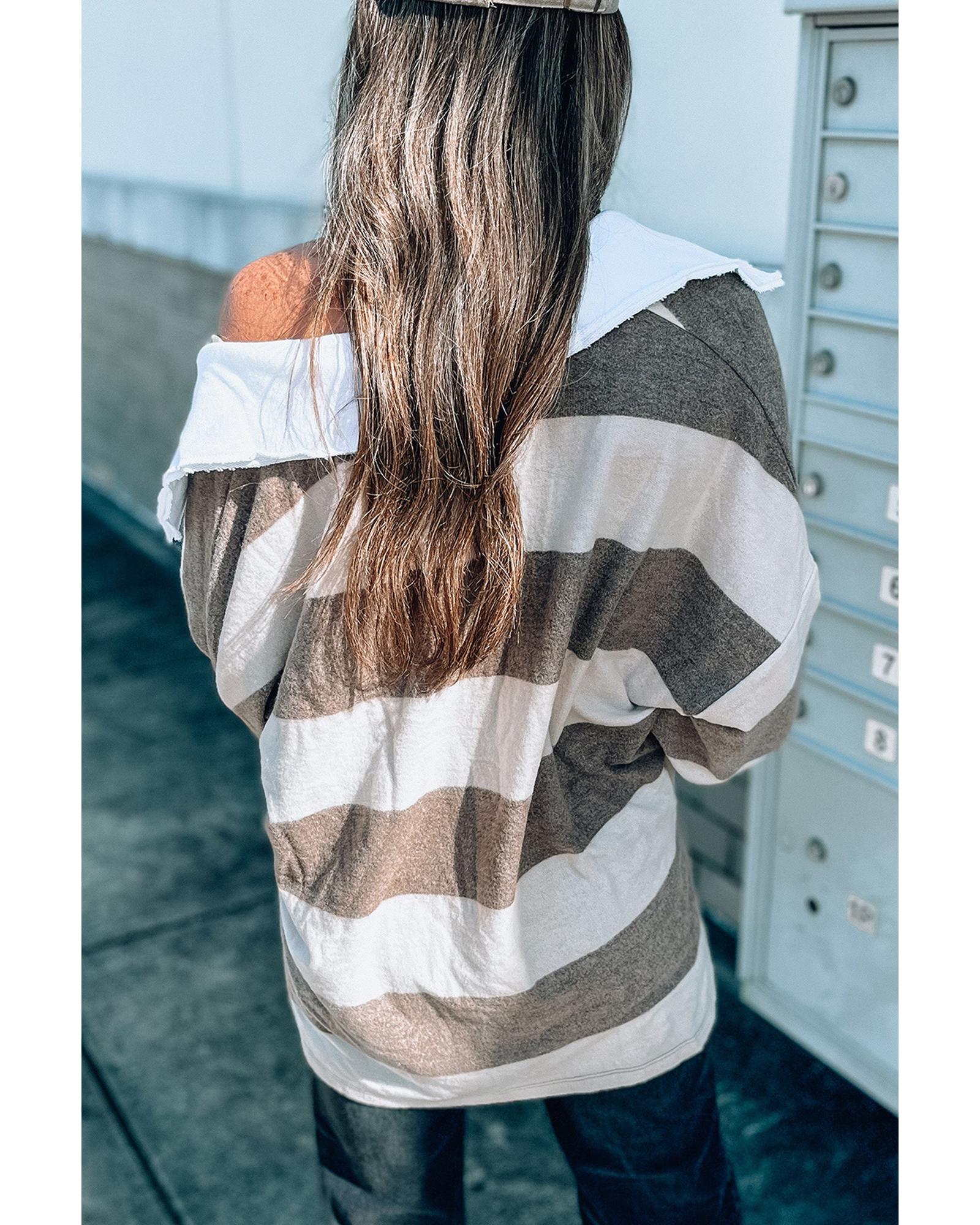 Trendy oversized top Classic striped print Turn - down collar Long sleeves Chest pocket Versatile and chic Perfect for casual yet trendy outfits High