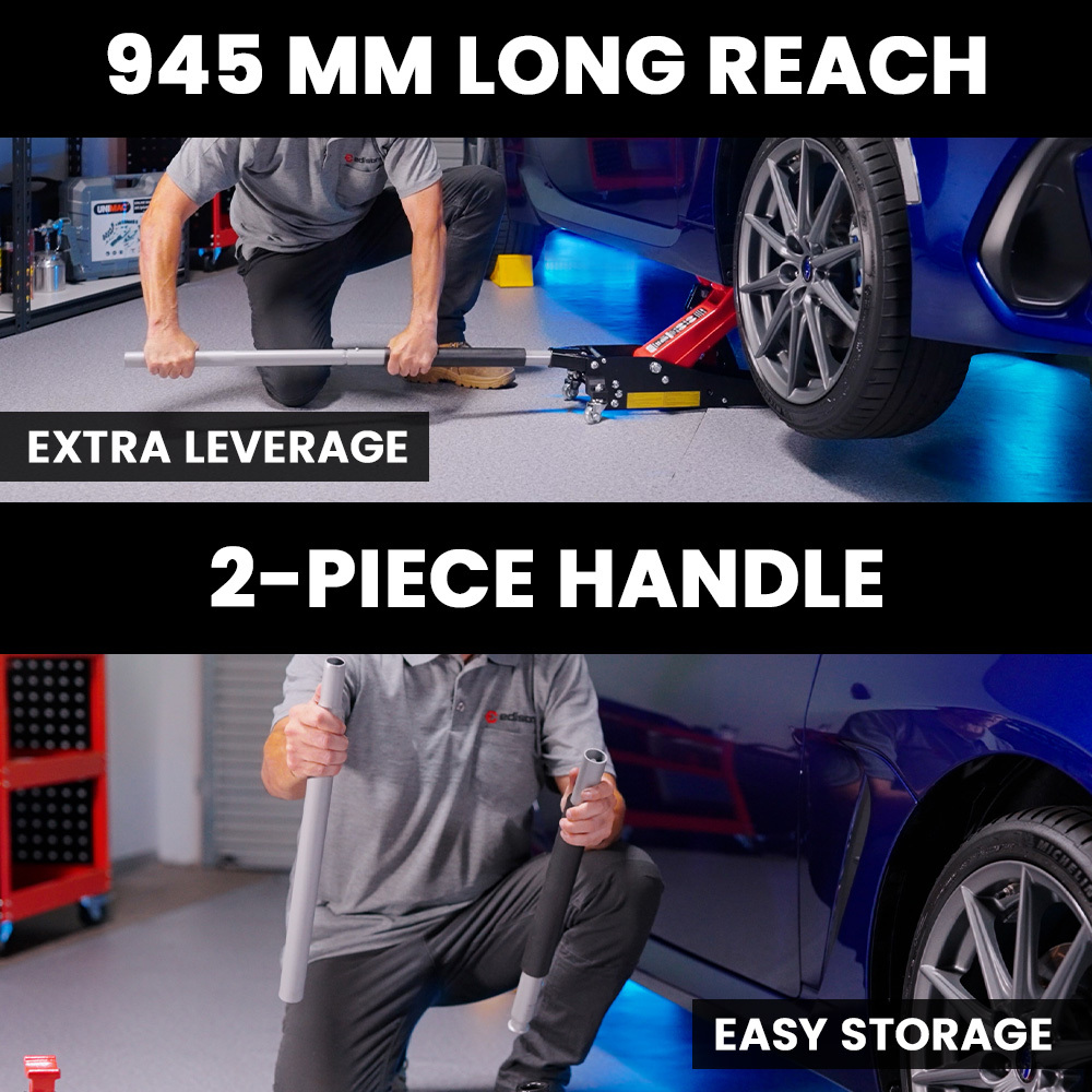 Designed for convenience, it incorporates side-mounted handles for easy lifting, and you can precisely position it with the one-piece front roller bar and 360-degree rear castor wheels. The two-piece aluminium handle with a knurled grip and bumper pad makes it easy to position. The dual-piston pump system lifts quickly and easily for efficient jacking.