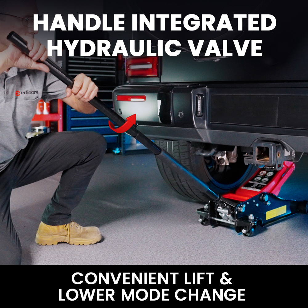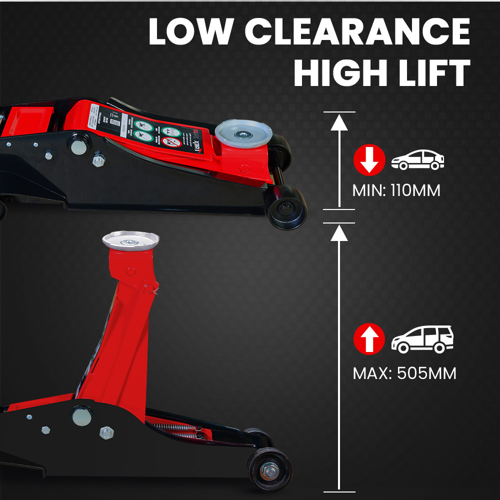 Lift your car easily with the Trex TFJ-30 3-tonne trolley floor jack. The Hardened Steel construction assures it handles big lifts. Designed for larger vehicles, it features a low profile of 110mm and a towering maximum height of 505mm, perfect for big cars, SUVs and utes.