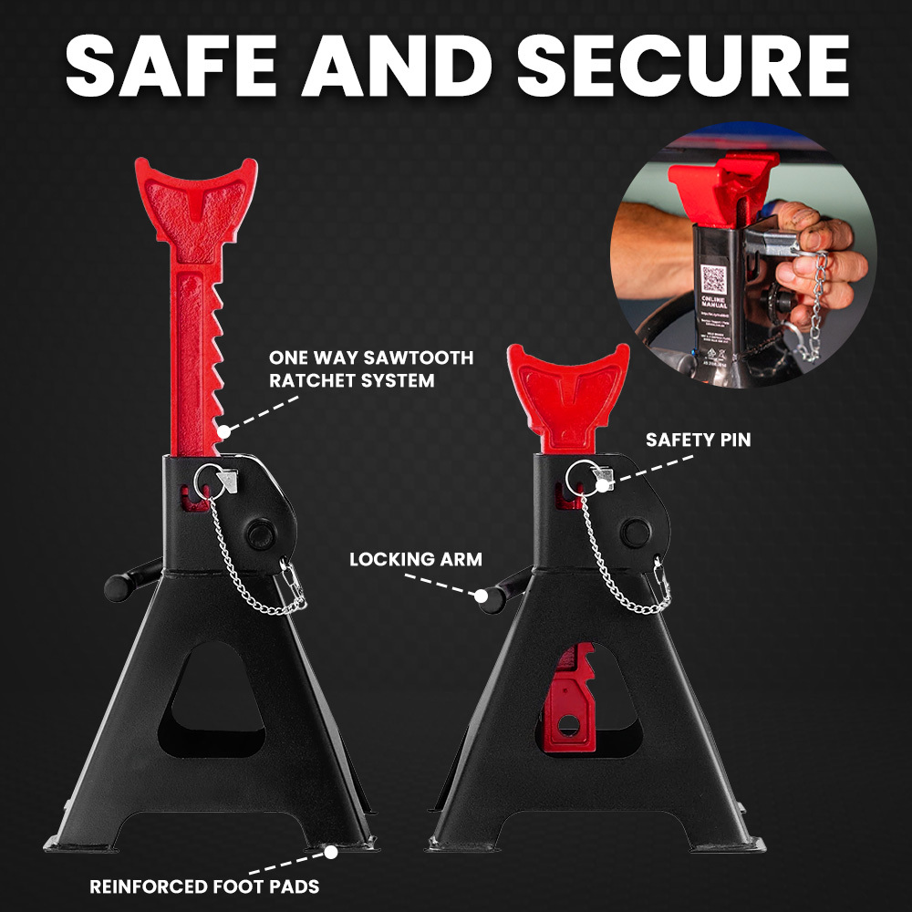 Crafted from durable steel, these Jack Stands prioritise safety through a ratcheting safety lock system, ensuring a solid foundation for any under-vehicle work. Rest assured whilst working under weight with AS 2538:2016 Australian standards compliance.