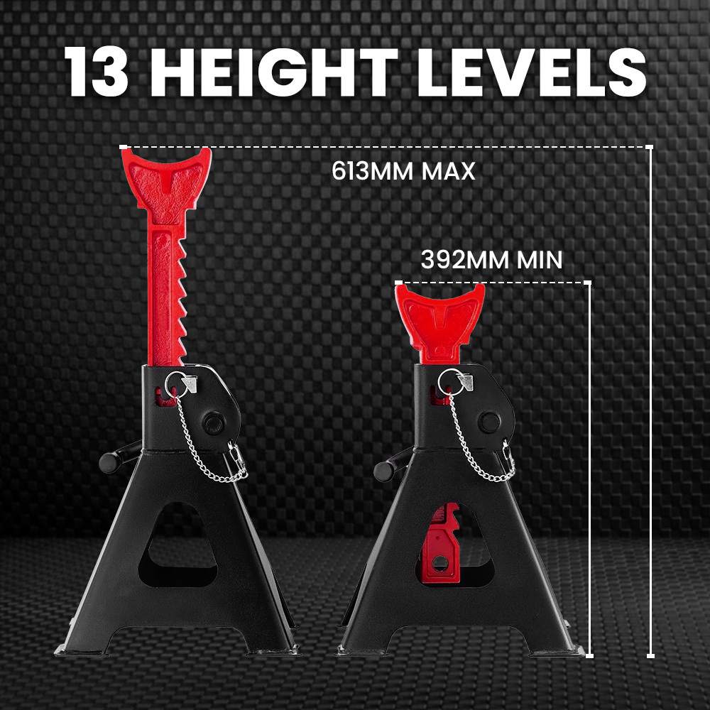 Enhance your automotive maintenance with our 2-Piece Jack Stands, featuring a 4000kg capacity and 13 levels of locking adjustment. From a minimum height of392mm to a maximum height of 613mm, these stands offer flexible and secure support to accommodate diverse automotive tasks.