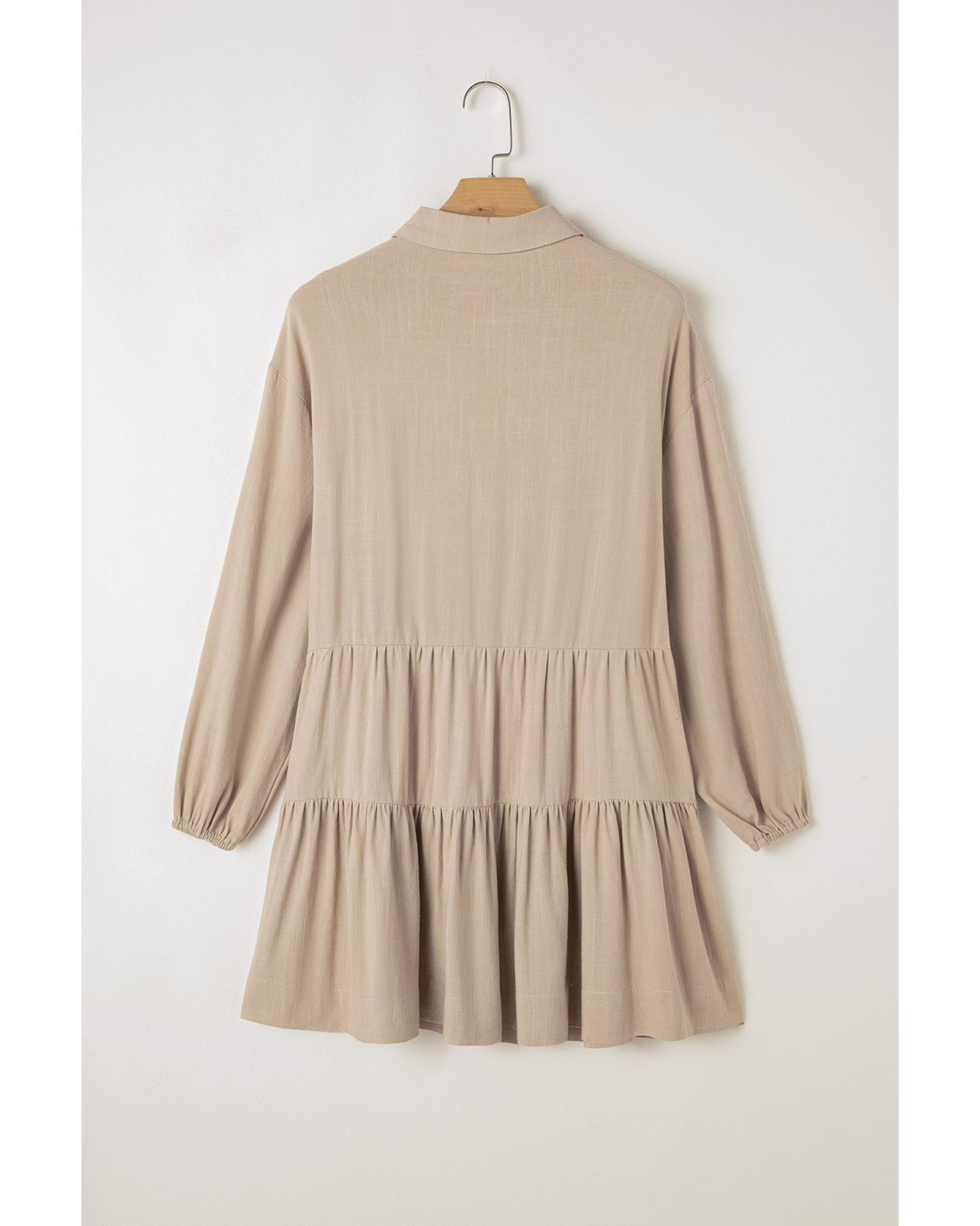 Tan Puff Sleeve Buttoned Tiered Pleated Shirt Mini Dress – XL