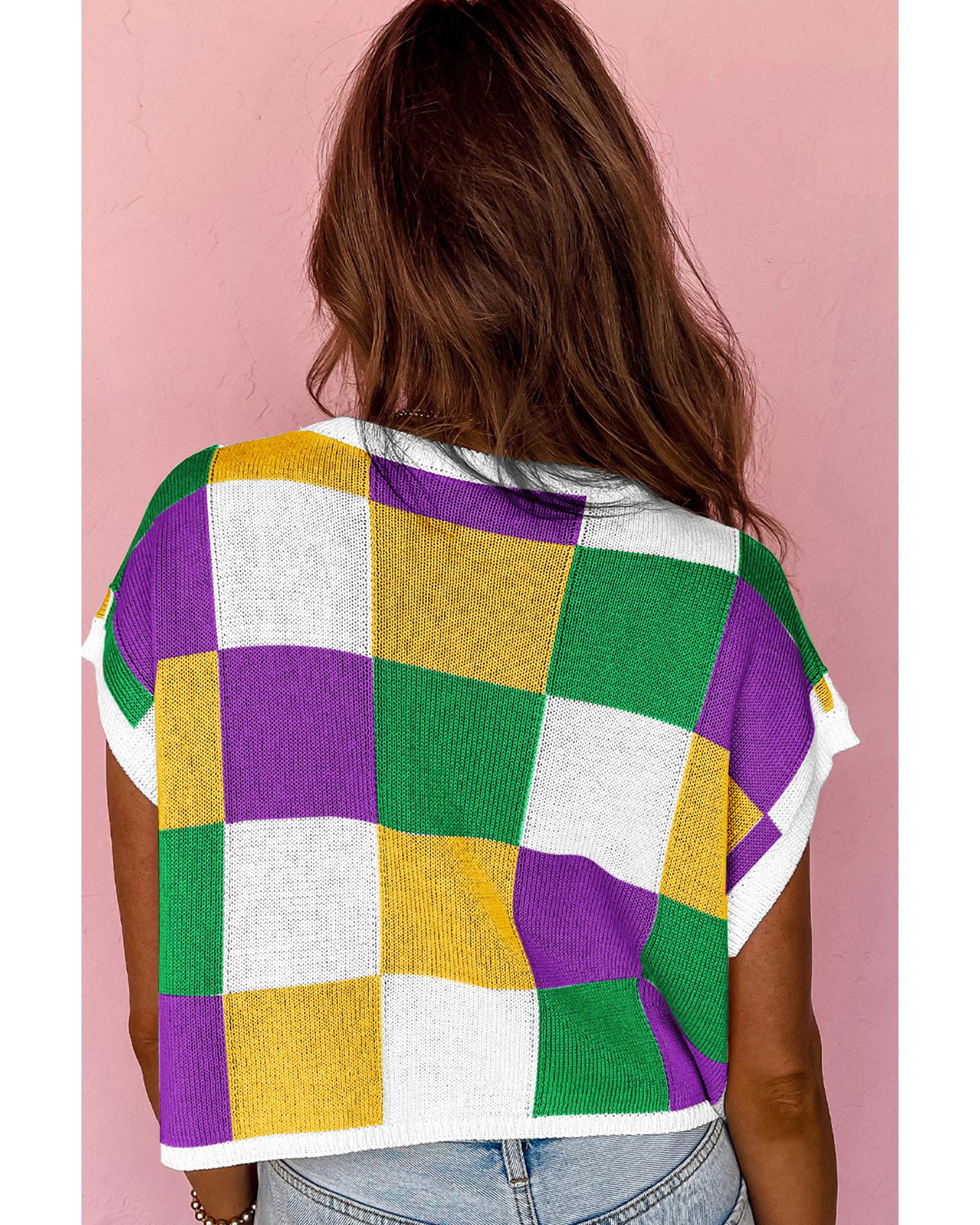 Tillandsia Purple Sequin Mardi Gras Fleur de Lis Color Block Sweater T Shirt – M