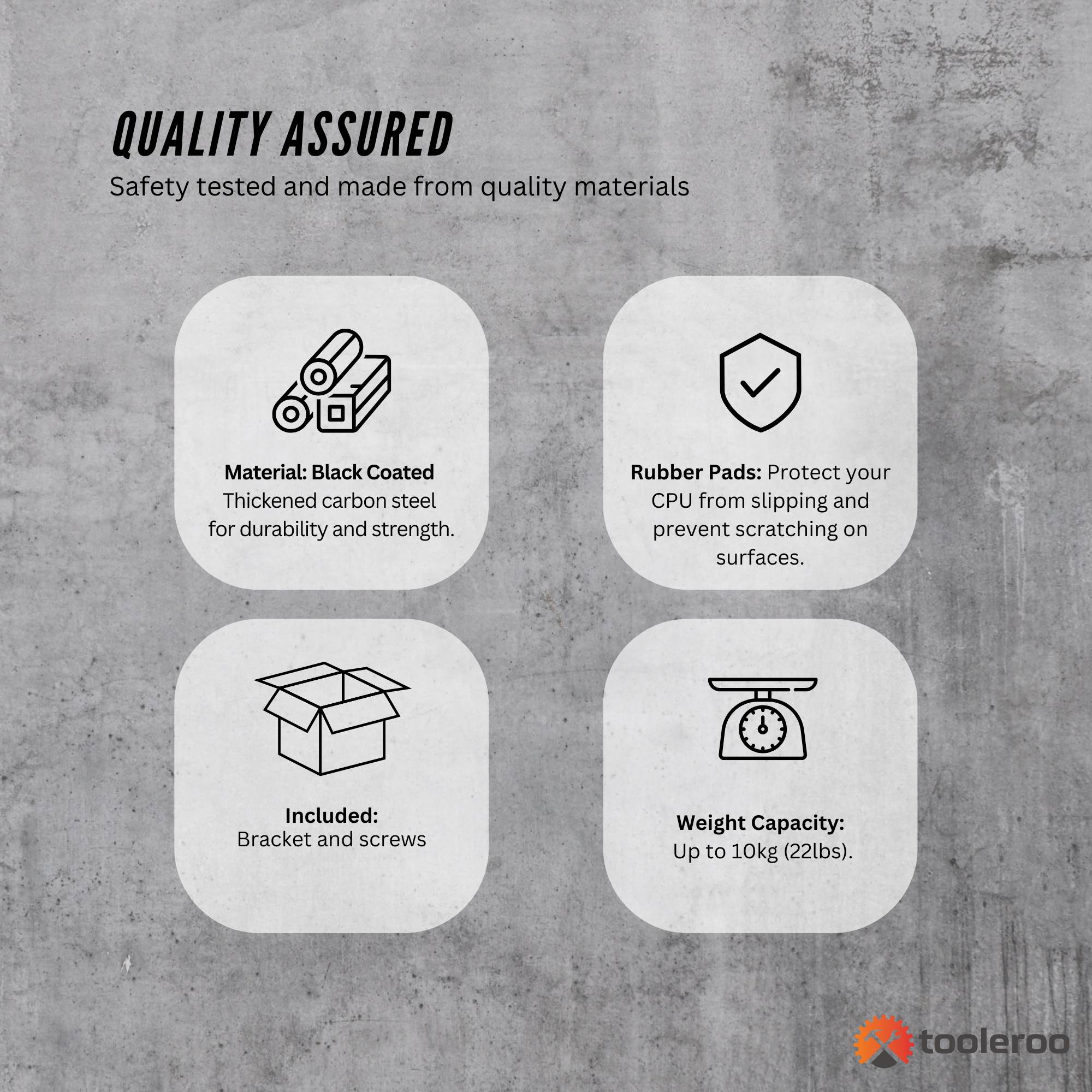 Revolutionise your workspace with the Tooleroo Under Desk CPU Mount, designed to provide convenience, organisation, and durability. With its adjustable design, 360° swivel mechanism, and robust construction, this computer tower stand is the ultimate solution for mounting your CPU securely under your desk.