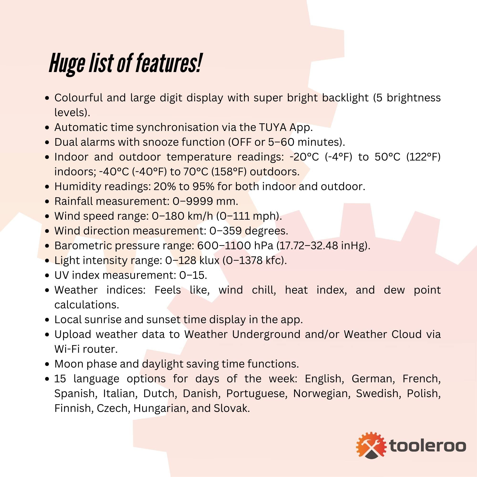 The Tooleroo Wireless 7-in-1 Weather Station is the ultimate WiFi Bluetooth Smart Weather Station, designed to provide full-function weather forecasting with precision and ease. Equipped with a comprehensive outdoor sensor, this digital clock delivers real-time data on temperature, humidity, wind speed, rainfall, UV index, and more, ensuring you’re always prepared for changing conditions.