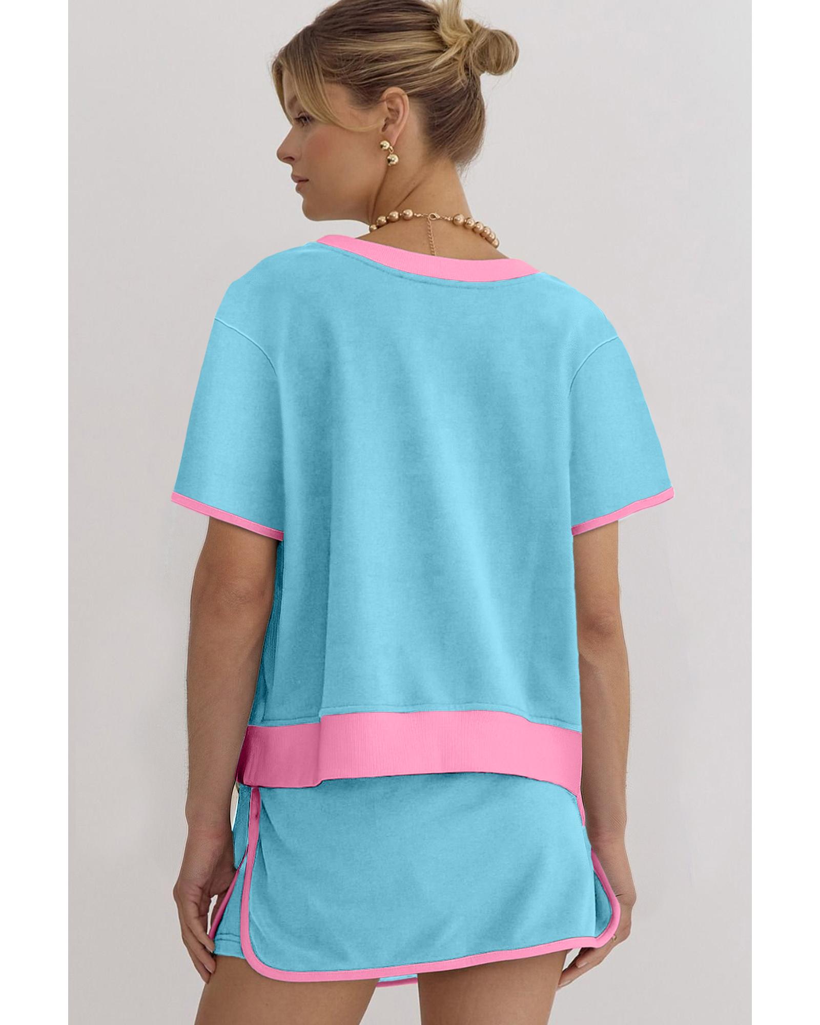 Turquoise Colorblock Edge Drop Shoulder T Shirt and Skirt 2Pcs Set – XL