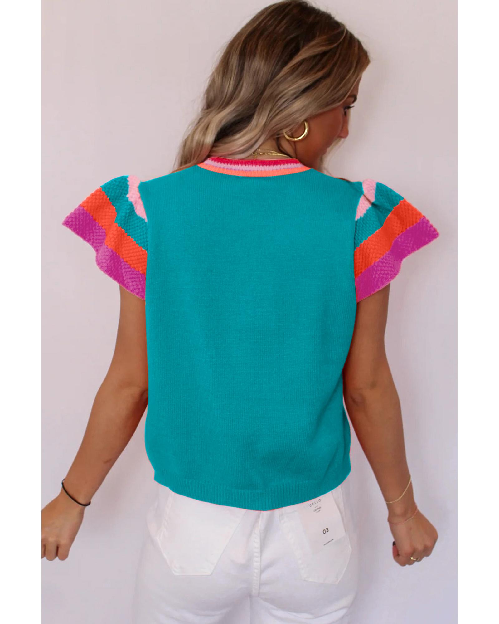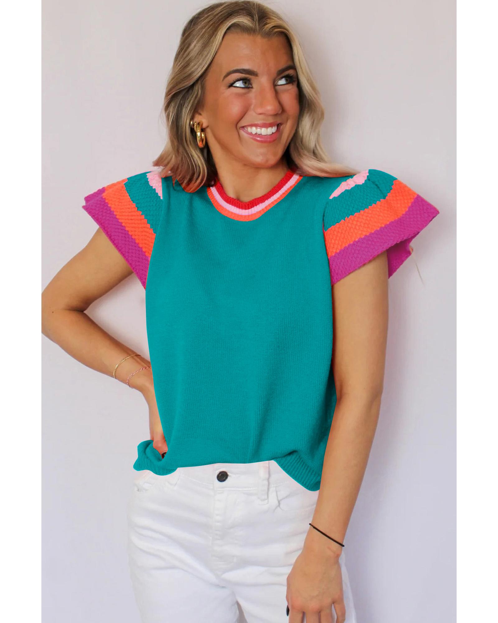 Turquoise Contrast Flutter Sleeves Knitted Sweater T Shirt – S