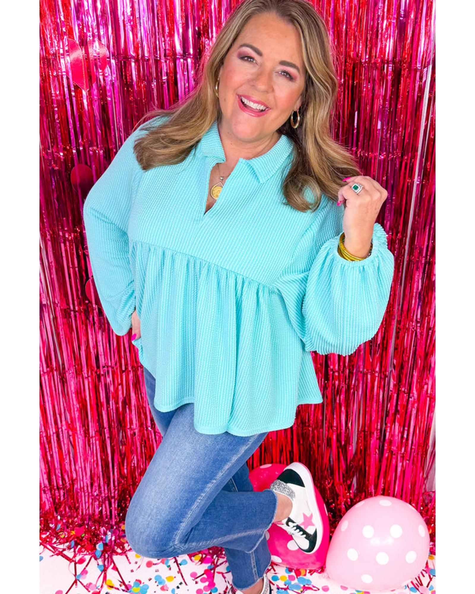 Turquoise Cordrd Balloon Sleeve Collar Plus Babydoll Top – 2X