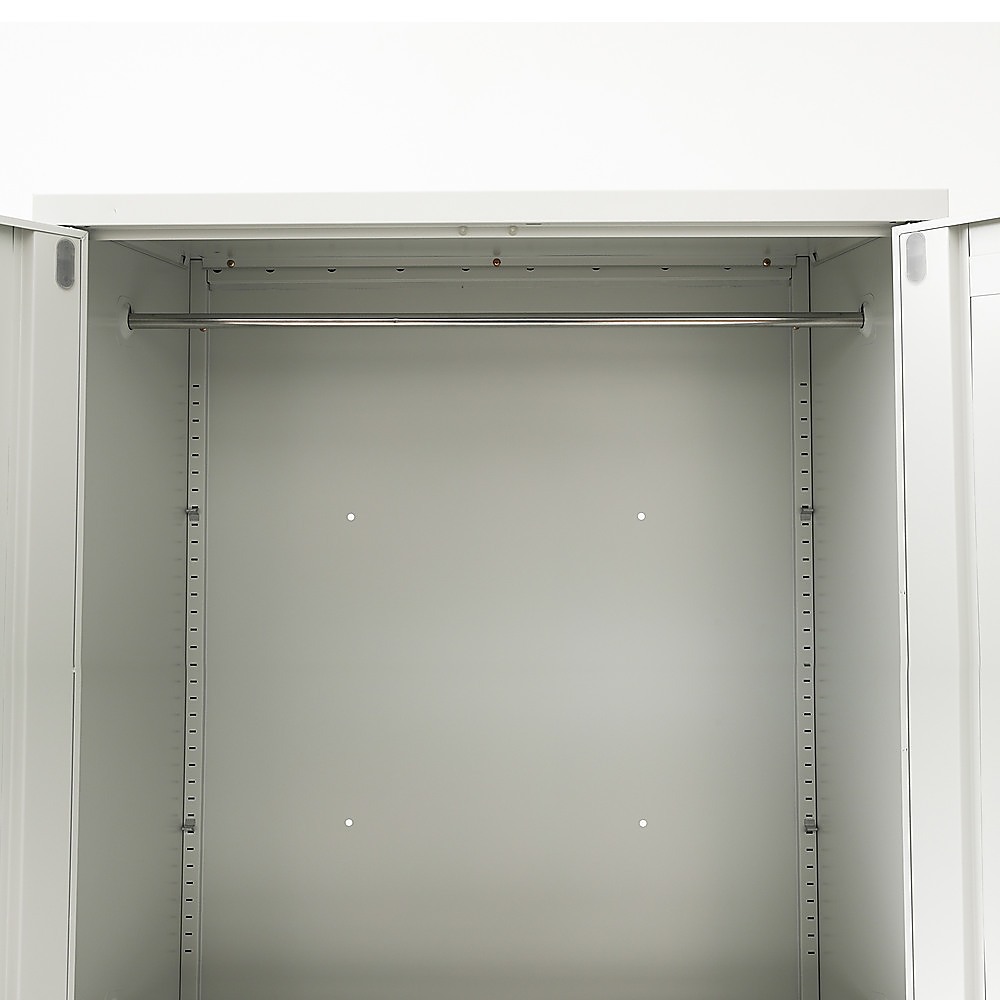 This two-door metal wardrobe made of cold-rolled steel of 0.6mm thickness, painted with special electrostatic paint for maximum resistance to moisture and corrosion.