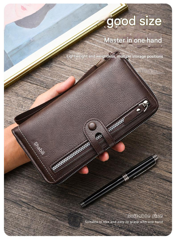 High-Capacity PU Leather Clutch Wallet – Unisex Design with Wrist Strap, Zipper & Multiple Card Slots