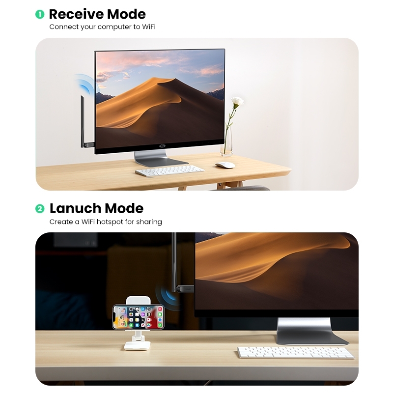 UGREEN WiFi Adapter for Desktop PC supports Station Mode and Soft AP mode at the same time. In Soft AP mode, you can convert your wired computer into a wifi hotspot for other devices to use.
