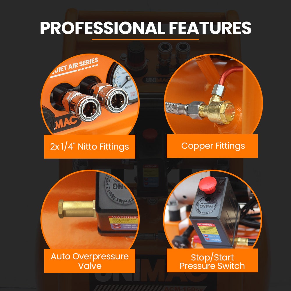 The Unimac ACM-160sv Quiet Series Oil-Free Air Compressor is a compact yet powerful unit, perfect for a variety of tasks, from light construction work to DIY projects at home.