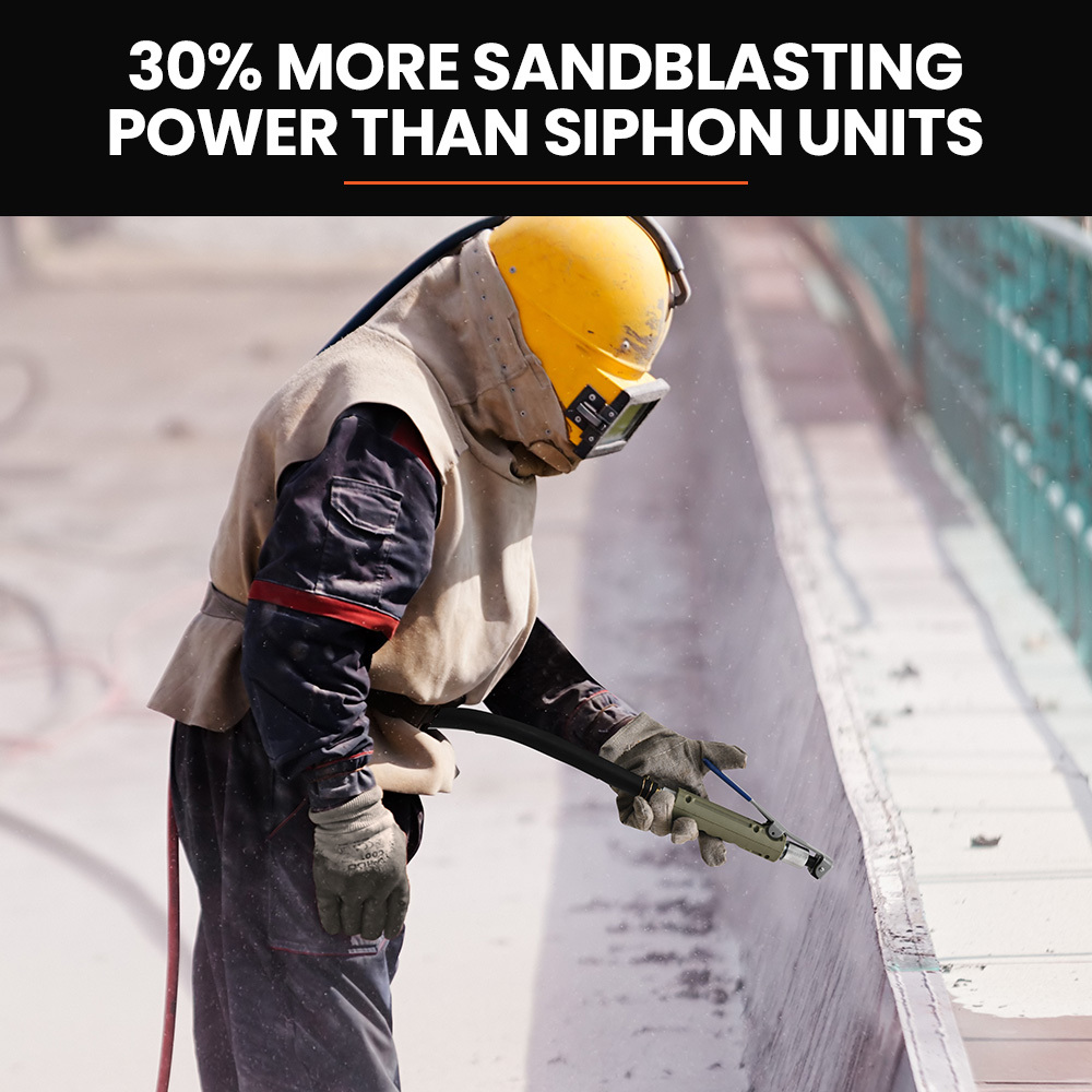 Made from quality steel plate with a precise pressure gauge and a 38-litre tank size with a 32-litre media capacity. It operates from 60 to 125 PSI and delivers 30% more blasting power than siphon units. Portable and efficient, it ensures you can tackle tasks on the go, with a heavy-duty tank and frame boasting a powder-coated finish for corrosion resistance, along with rubber-gripped handles and sturdy wheels for mobility and easy maneuverability.