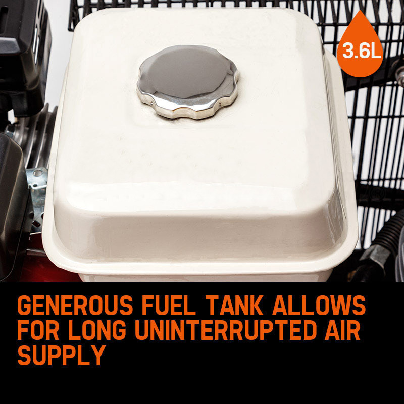 This impressive unit is powered by an ultra dependable 8HP petrol powered OHV engine. Couple this with the oversize 120L receiver and you’ve got a workhorse that has the ability to deliver 477 litres per minute of free air, all whilst maintaining a strong 115PSI even under the most demanding load! With a large 3.6L fuel tank and huge free air capacity, you will not find a better option for uninterrupted air supply