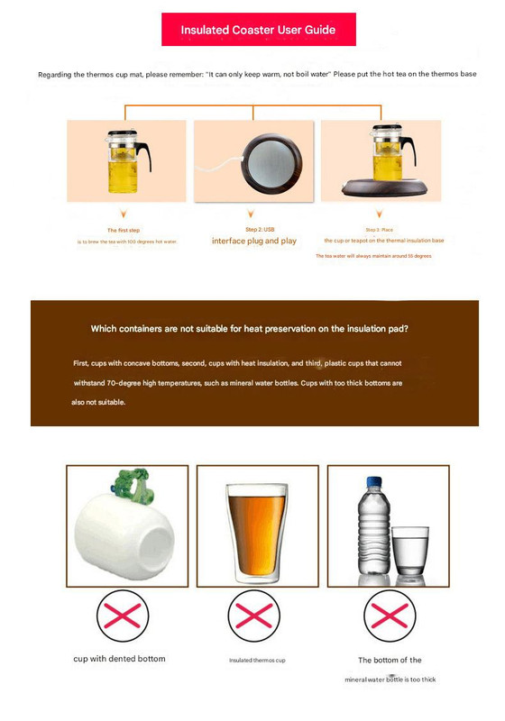 - Constant Temperature Maintenance: Keeps your hot beverage warm (around 55℃), preventing it from cooling down. Please note: This device is designed to keep warm drinks warm, not to heat cold drinks quickly or boil water.