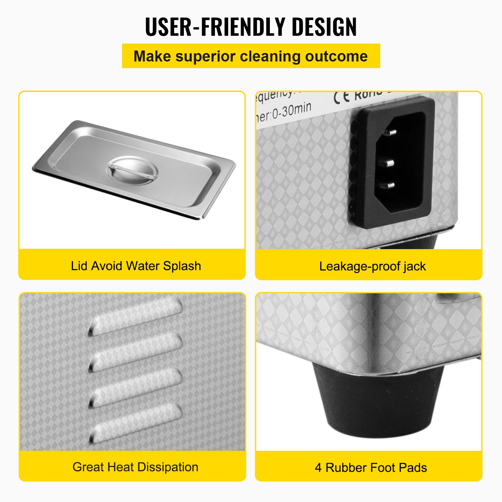 Tabletop ultrasonic washer, light-weight and easy to carry/move. It is designed for better customer use: washing basket, safe socket, heat dissipation, anti-slide rubber feet, and top lid with handle.